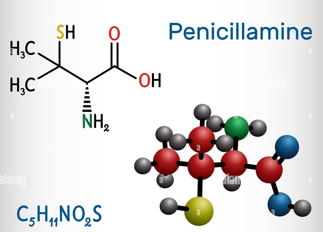 Penicillamine (C₅H₁₁NO₂S) là một aminosulfhydryl, được tổng hợp từ thủy phân penicillin. Khác với penicillin, nó không tiêu diệt vi khuẩn mà tập trung vào liên kết và đào thải kim loại nặng.