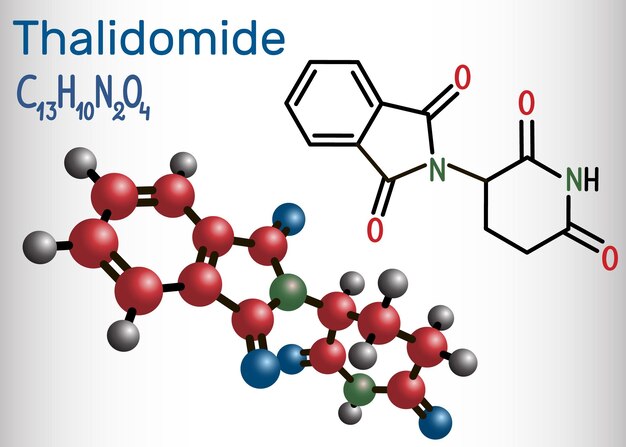 Thalidomide là một dẫn xuất của axit glutamic, có công thức hóa học C13H10N2O4. Cấu trúc hóa học của Thalidomide bao gồm một nhân phthalimide và một nhân glutarimide, với một nguyên tử carbon bất đối (chiral), tạo ra hai dạng đối quang (enantiomer) là R-thalidomide và S-thalidomide. Cả hai dạng này có thể chuyển đổi lẫn nhau trong cơ thể (racemization), khiến việc tách biệt chúng trở nên khó khăn.