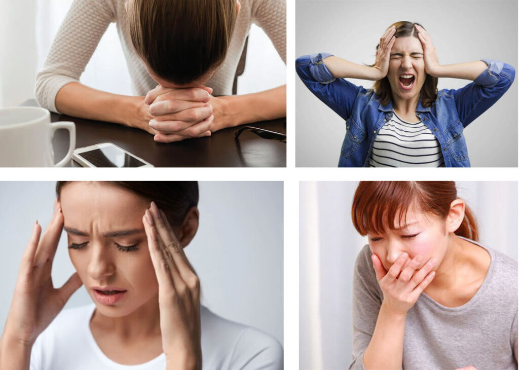 - Đau đầu, chóng mặt, khát nước, tiêu chảy, sốt, mất ngủ, căng thẳng, lo lắng, bồn chồn, tăng huyết áp,…