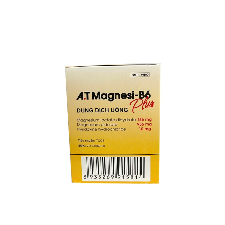 A.T Magnesi-B6 Plus là thuốc bổ thần kinh dạng dung dịch uống đóng ống 10ml, thuộc nhóm thuốc bổ sung khoáng chất và vitamin. Sản phẩm được sản xuất tại Việt Nam bởi Công ty Cổ phần Dược phẩm An Thiên – đơn vị uy tín chuyên dược phẩm generic chất lượng cao. Số đăng ký lưu hành: VD-34569-20, hạn sử dụng 36 tháng.