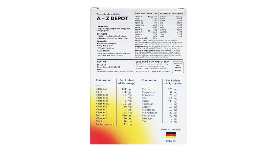 Tại Việt Nam, A-Z Depot được nhập khẩu chính hãng và phân phối rộng rãi qua các nhà thuốc lớn như Nhà thuốc Bạch Mai hay các nền tảng trực tuyến nhathuocbachmai.vn. Sản phẩm đã nhận được giấy phép từ Bộ Y tế Việt Nam (MSDN: 0105381169), đảm bảo an toàn và chất lượng theo tiêu chuẩn châu Âu.
