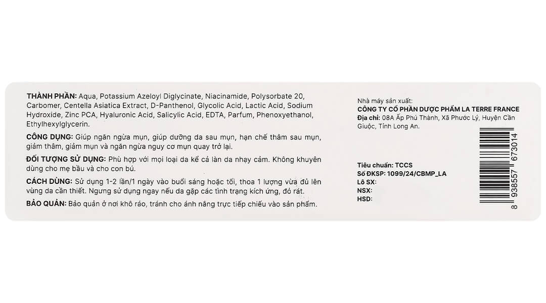 - Thành phần chính: Azelaic Deriv, AHA, Niacinamide, Vitamin B3, B5, HA, Zinc PCA, BHA.