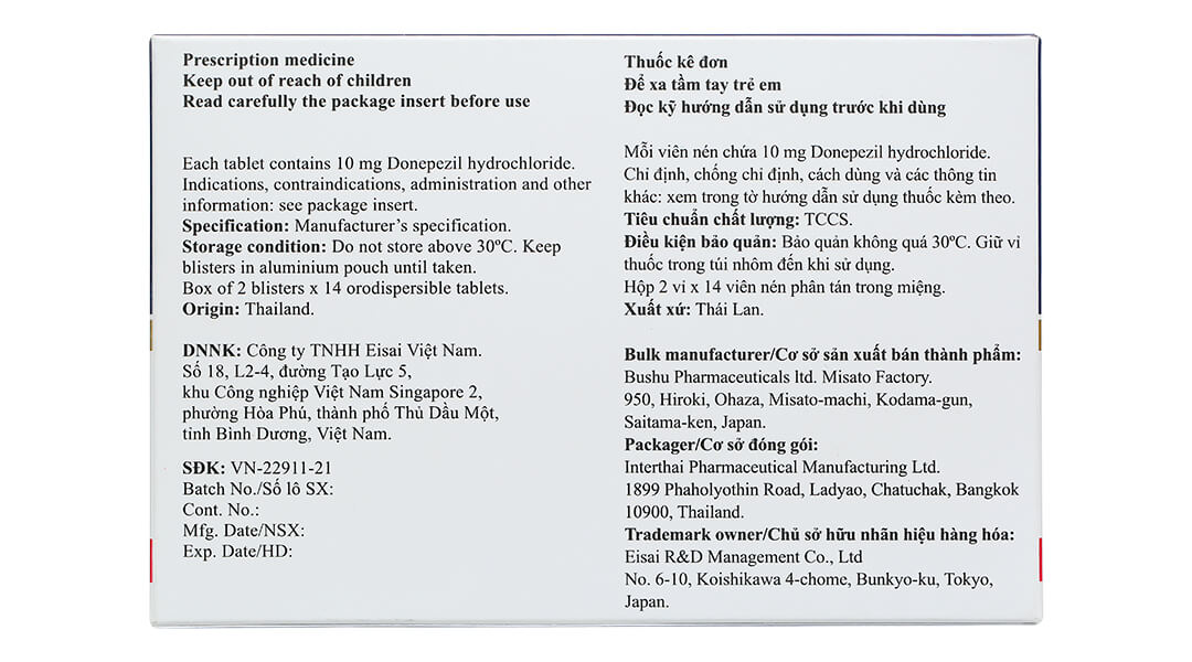 Donepezil hydrochloride 10mg: Đây là hoạt chất chính, thuộc nhóm ức chế men cholinesterase chọn lọc. Donepezil ngăn chặn enzyme acetylcholinesterase, làm tăng nồng độ acetylcholine trong khe synap thần kinh, cải thiện truyền tín hiệu giữa các tế bào não. Điều này giúp tăng cường chức năng nhận thức, trí nhớ và khả năng xử lý thông tin ở bệnh nhân Alzheimer. Donepezil có sinh khả dụng cao (gần 100%), hấp thu nhanh qua đường tiêu hóa hoặc niêm mạc miệng, đạt nồng độ đỉnh trong huyết tương sau 3-4 giờ, với thời gian bán hủy khoảng 70 giờ, cho phép dùng 1 lần/ngày.