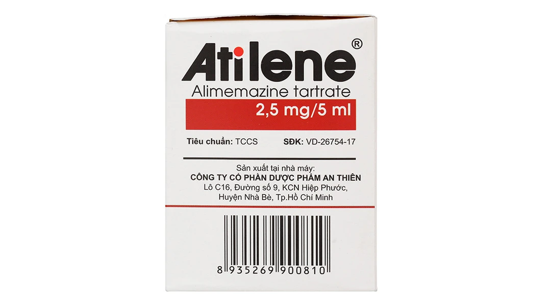 Thuốc Atilene 2.5mg/5ml được sản xuất bởi Công ty Cổ phần Dược phẩm An Thiên (Việt Nam), một doanh nghiệp đạt chuẩn GMP-WHO, và đã được Cục Quản lý Dược phẩm – Bộ Y tế Việt Nam cấp phép lưu hành với số đăng ký VD-26754-17. Sản phẩm được bào chế dưới dạng dung dịch uống tiện lợi (ống 5ml), đóng gói hộp 30 ống, phù hợp cho cả người lớn và trẻ em trên 2 tuổi. Với liều lượng chính xác 2.5mg Alimemazin tartrat mỗi ống, Atilene 2.5mg/5ml không chỉ giảm nhanh triệu chứng dị ứng mà còn hỗ trợ an thần, tiền mê trước phẫu thuật. Hãy cùng khám phá chi tiết để hiểu rõ hơn về loại thuốc này, giúp bạn tự tin hơn trong việc chăm sóc sức khỏe gia đình.