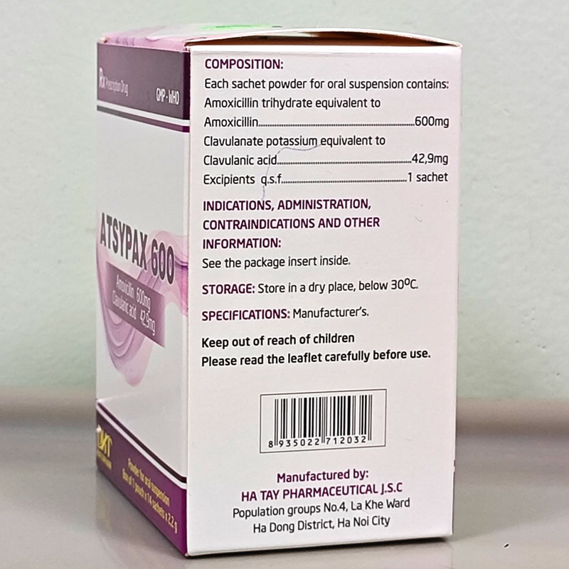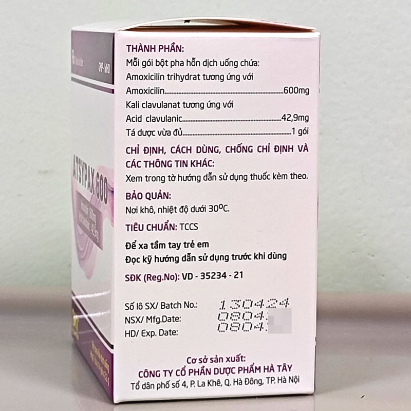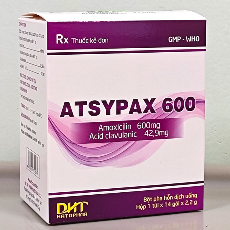 Atsypax 600 là một loại kháng sinh kết hợp thuộc nhóm beta-lactam, được sản xuất bởi Công ty Cổ phần Dược phẩm Hà Tây (Hataphar) – một trong những đơn vị dược phẩm uy tín hàng đầu tại Việt Nam với hơn 50 năm kinh nghiệm. Sản phẩm được bào chế dưới dạng bột pha hỗn dịch uống, đóng gói hộp 14 gói x 2,2g, thuận tiện cho sử dụng tại nhà, đặc biệt phù hợp với trẻ em và người lớn tuổi gặp khó khăn khi nuốt viên. Với số đăng ký lưu hành VD-35234-21, Atsypax 600 đáp ứng đầy đủ các tiêu chuẩn chất lượng nghiêm ngặt của Bộ Y tế theo quy định GMP (Good Manufacturing Practice).