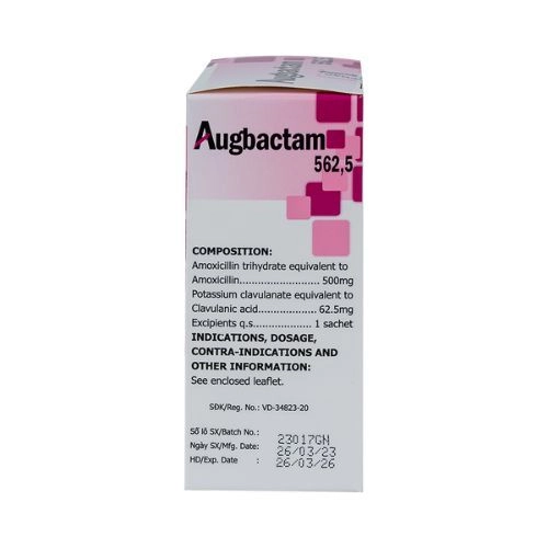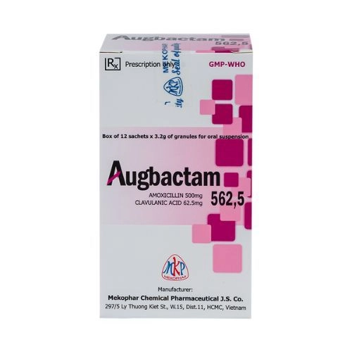 Thuốc Augbactam 562.5mg là thuốc kê đơn thuộc nhóm kháng sinh nhóm beta-lactam, dạng kết hợp của hai hoạt chất chính: Amoxicillin (dưới dạng Amoxicillin trihydrat) và Acid clavulanic (dưới dạng Kali clavulanat). Sản phẩm được bào chế dưới dạng bột pha hỗn dịch uống dạng gói, mỗi gói chứa 3,2g bột. Quy cách đóng gói phổ biến hiện nay là hộp 12 gói, thuận tiện trong vận chuyển và sử dụng cho cả người lớn lẫn trẻ em.