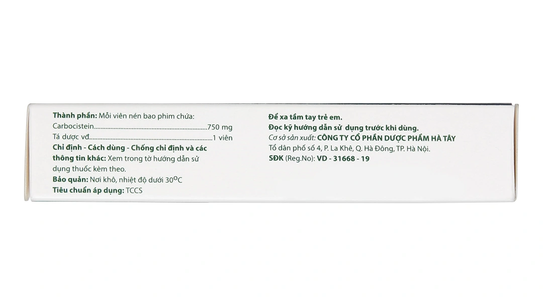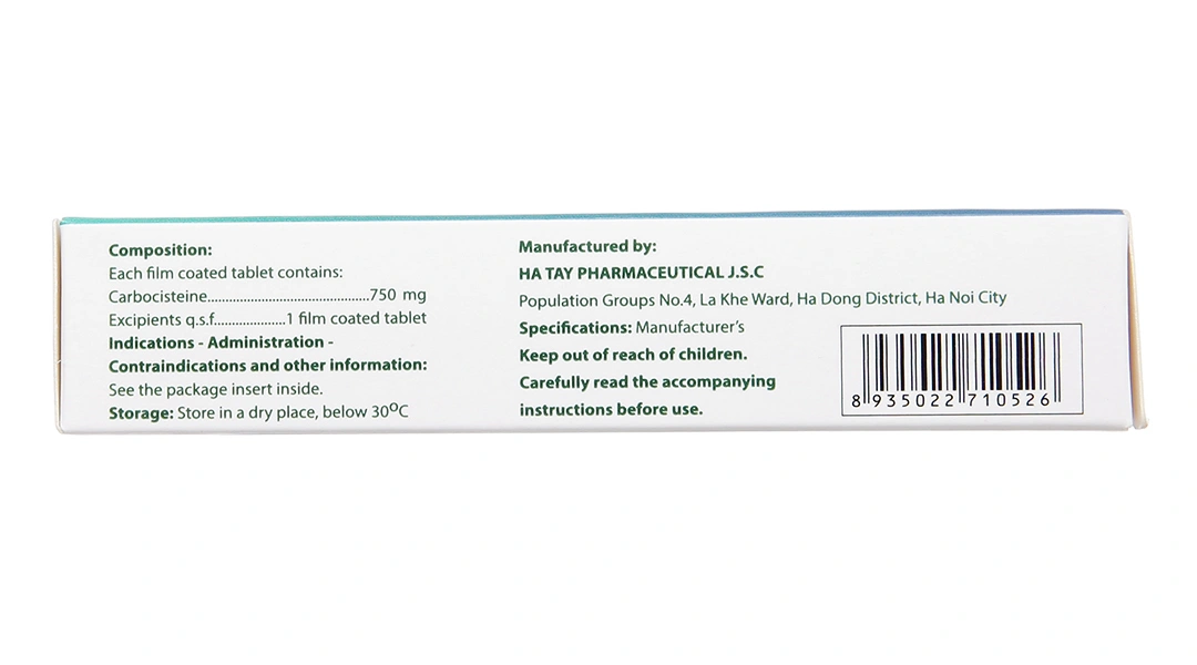 - Tên hoạt chất: Carbocisteine (S-carboxymethylcysteine) 750mg.