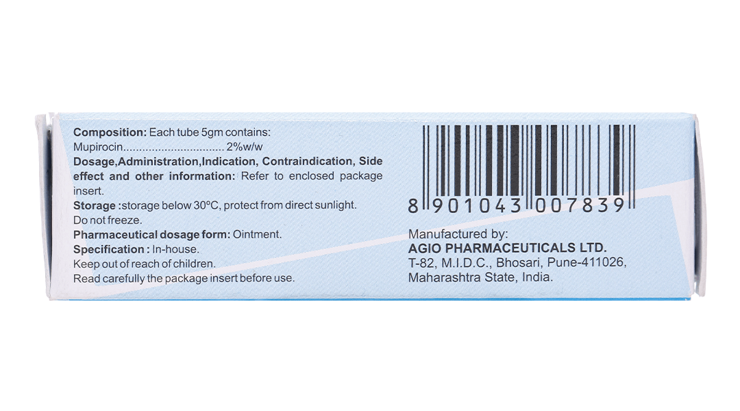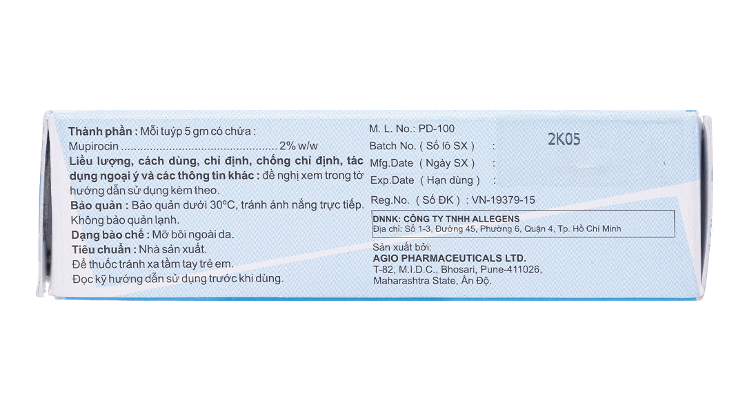- Mupirocin 2.0% (tương đương 100mg): Hoạt chất chính, một kháng sinh tự nhiên chiết xuất từ Pseudomonas fluorescens. Mupirocin hoạt động bằng cách gắn thuận nghịch vào enzyme isoleucyl-tRNA synthetase của vi khuẩn, ức chế tổng hợp protein, dẫn đến kìm hãm ở nồng độ thấp và diệt khuẩn ở nồng độ cao. Nó đặc biệt hiệu quả với Staphylococcus aureus (kể cả chủng kháng methicillin – MRSA) và Streptococcus, cũng như một số vi khuẩn Gram âm như Escherichia coli và Haemophilus influenzae.