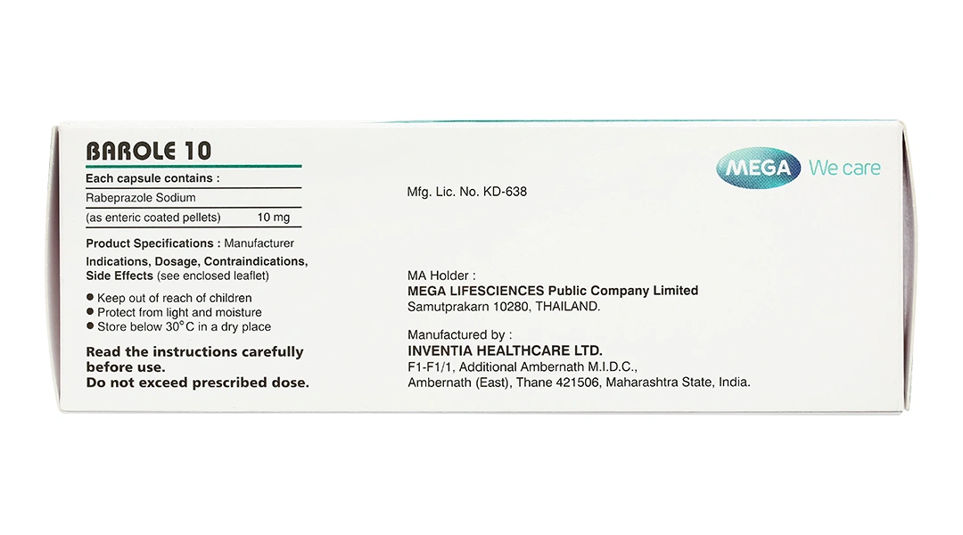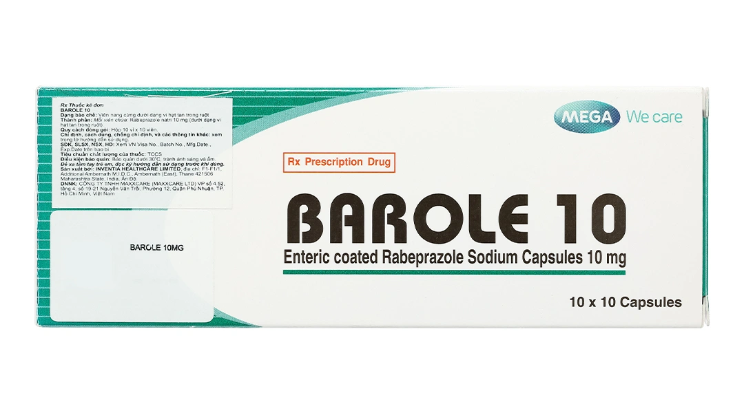 Thuốc Barole 10 (hay Barole 10mg) là sản phẩm của công ty Inventia Healthcare Pvt. Ltd (Ấn Độ), được phân phối tại Việt Nam dưới dạng viên nang cứng. Đây là thuốc thuộc nhóm ức chế bơm proton (PPI), với hoạt chất chính Rabeprazole natri 10mg (dưới dạng vi hạt tan trong ruột).