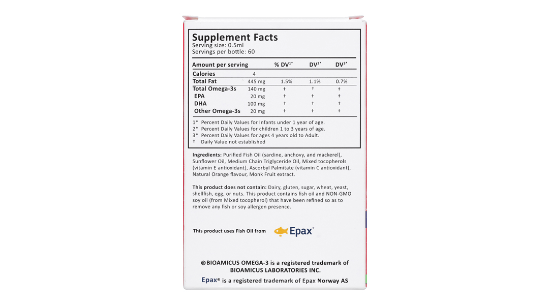 Theo Hiệp hội Nhi khoa Mỹ, trẻ sơ sinh cần ít nhất 100mg DHA/ngày, và BioAmicus Omega-3 đáp ứng chính xác nhu cầu này với liều nhỏ 0,5ml.