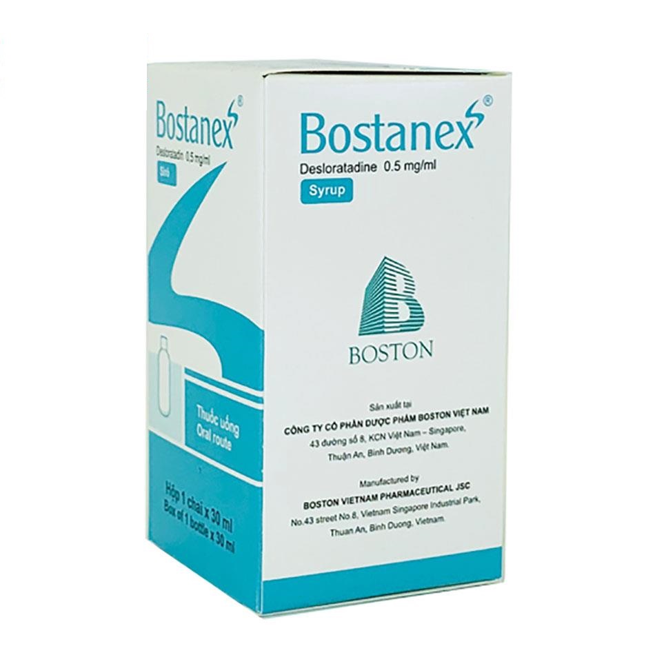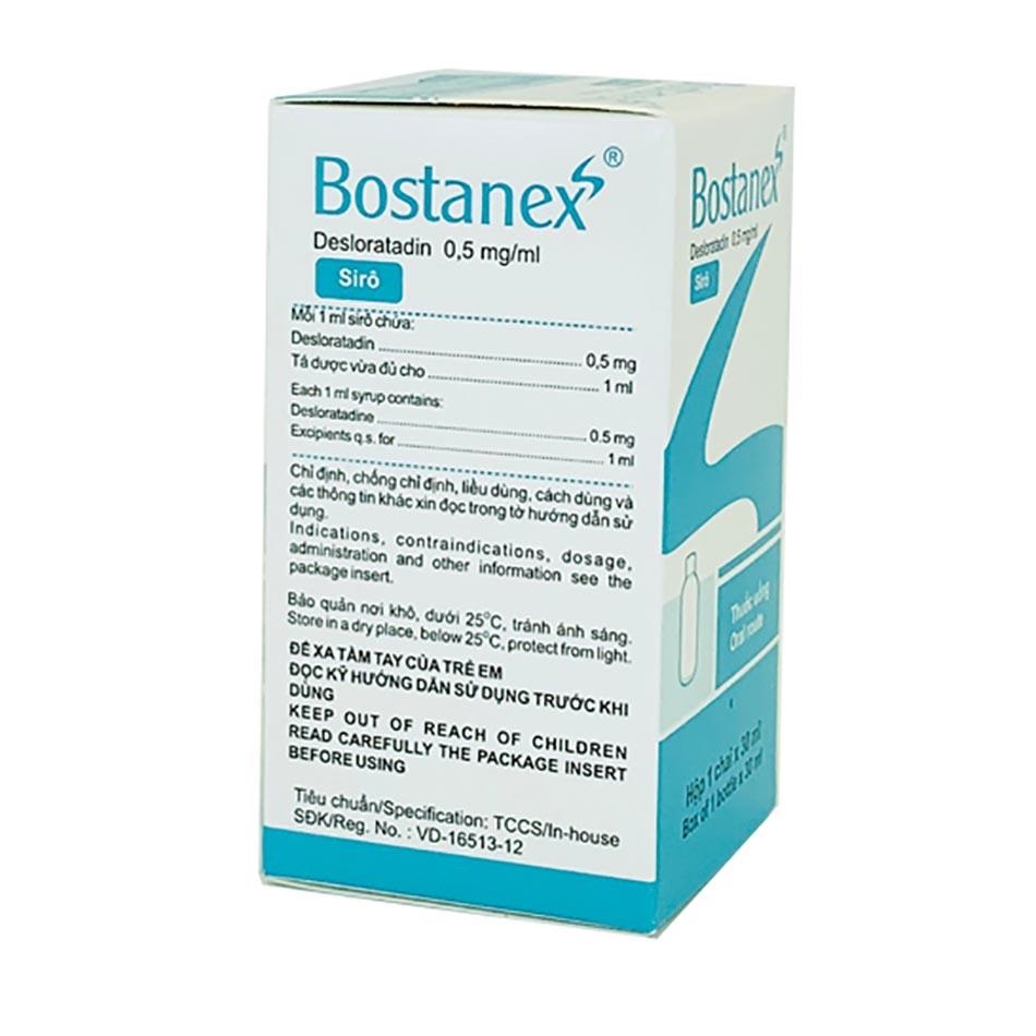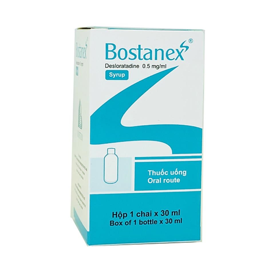 Bostanex 30ml là thuốc siro kháng dị ứng, thuộc nhóm thuốc chống dị ứng và dùng trong các trường hợp quá mẫn. Sản phẩm được bào chế dưới dạng dung dịch uống ngọt nhẹ, dễ uống cho trẻ em, đóng gói trong chai thủy tinh tối màu 30ml (có nắp đậy và muỗng đong đi kèm ở một số lô hàng).