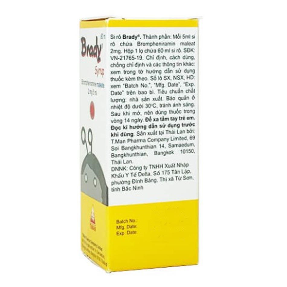 Thuốc Brady 60ml (Brady Syrup) là siro kháng histamin Brompheniramine hiệu quả, giá thành hợp lý, giúp giảm nhanh triệu chứng hắt hơi, sổ mũi, ngứa mũi, chảy nước mắt do dị ứng hoặc cảm lạnh thông thường. Dạng siro 60ml tiện lợi, dễ sử dụng cho cả gia đình, đặc biệt vào mùa dị ứng hoặc thời tiết chuyển mùa tại Việt Nam.