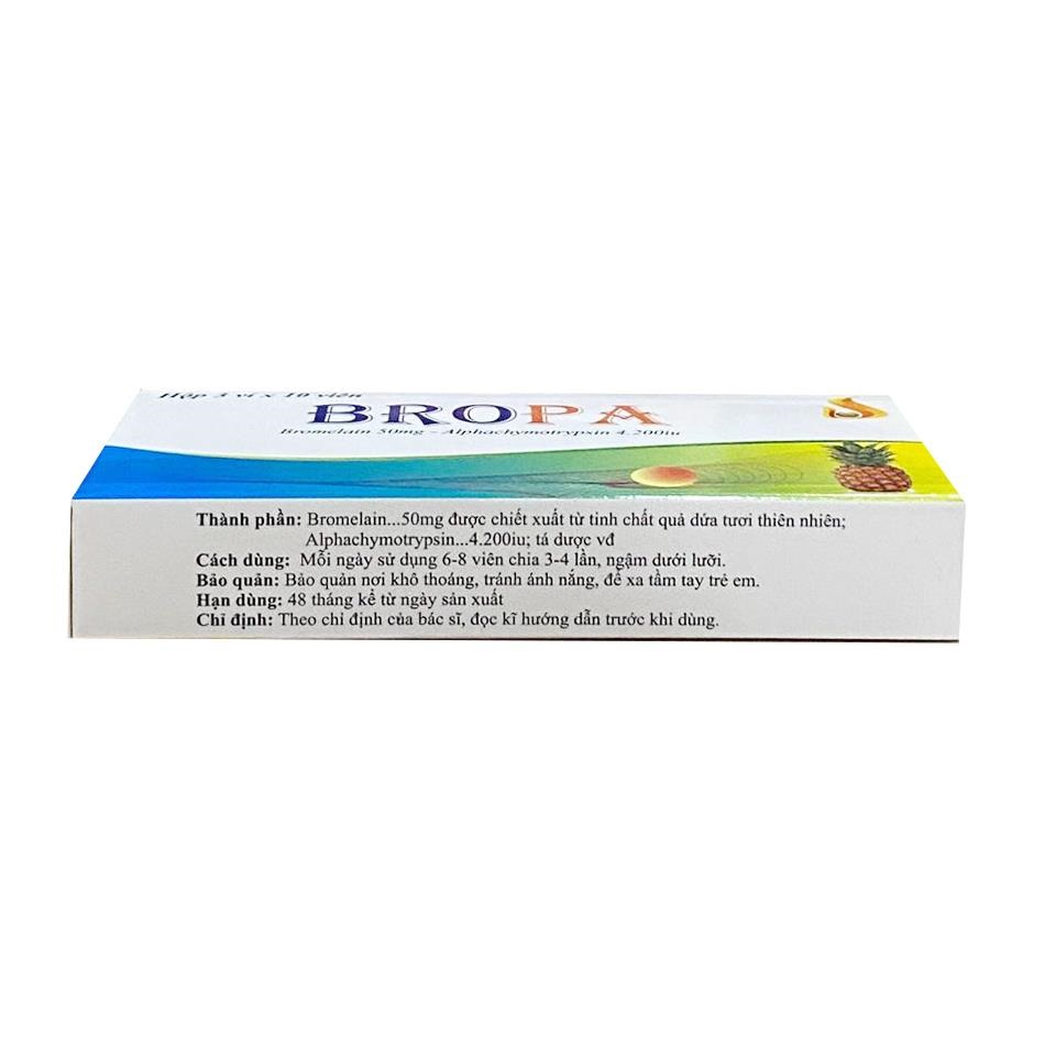 Bropa không phải là thuốc kê đơn bắt buộc, nhưng nên dùng theo chỉ định của bác sĩ để đảm bảo an toàn. Thành phần chính được chiết xuất từ quả dứa tươi (pineapple), một nguồn enzyme tự nhiên đã được sử dụng trong y học cổ truyền hàng thế kỷ. Tại Việt Nam, thuốc Bropa 50mg được phân phối rộng rãi qua các nhà thuốc lớn như Nhà Thuốc Bạch Mai, với giấy chứng nhận chất lượng từ Cục An toàn Thực phẩm – Bộ Y tế.