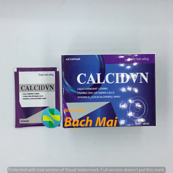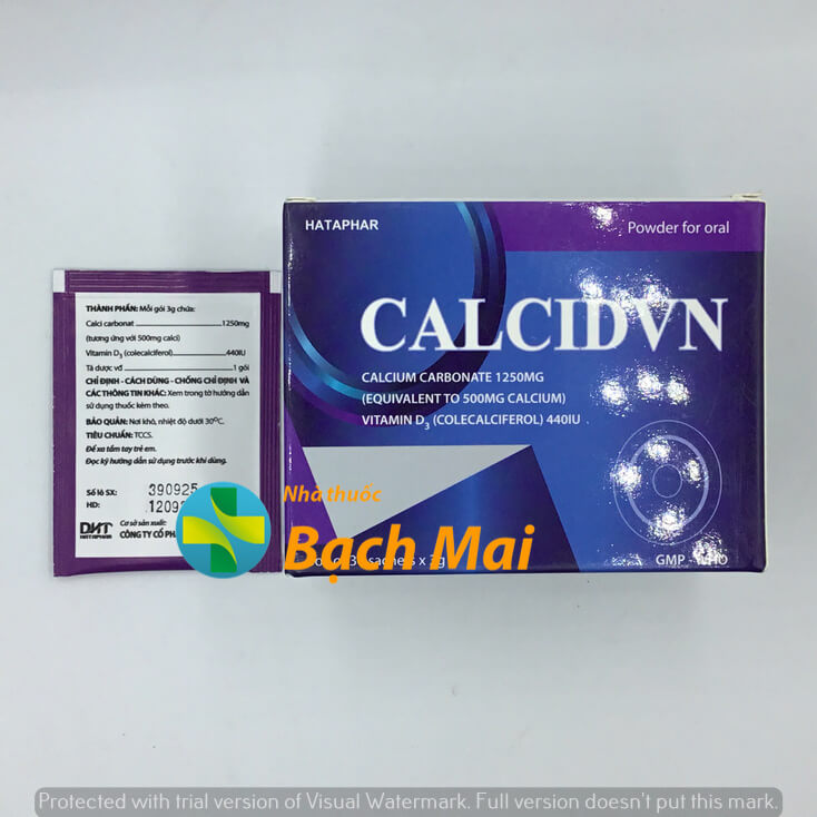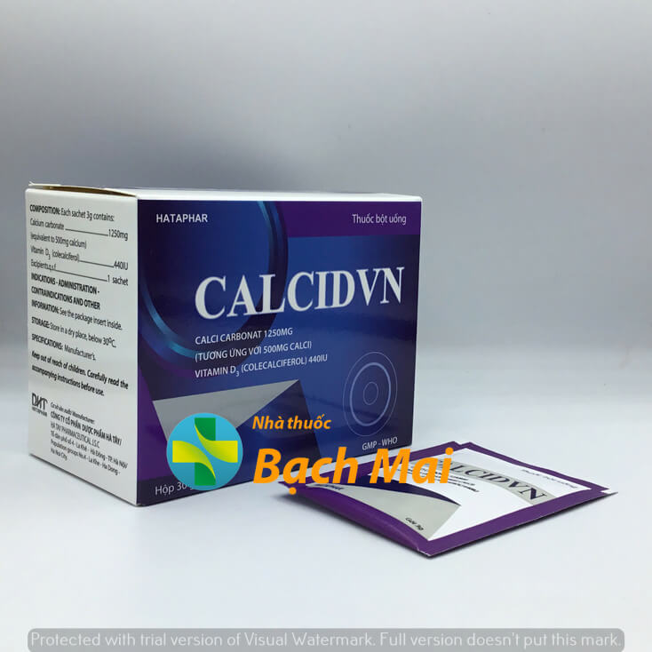 Thuốc Calcidvn 3g là một sản phẩm bổ sung canxi và vitamin D3 được sản xuất bởi Công ty Cổ phần Dược phẩm Hà Tây (Hataphar), Việt Nam. Với thành phần chính là Calci carbonat (tương đương 500mg canxi) và Vitamin D3 440IU, Calcidvn 3g được bào chế dưới dạng bột pha uống, đóng gói hộp 30 gói, mỗi gói 3g. Thuốc được chỉ định để hỗ trợ điều trị và phòng ngừa các tình trạng thiếu hụt canxi và vitamin D, đặc biệt ở người cao tuổi, phụ nữ mang thai, cho con bú hoặc những người mắc bệnh loãng xương.