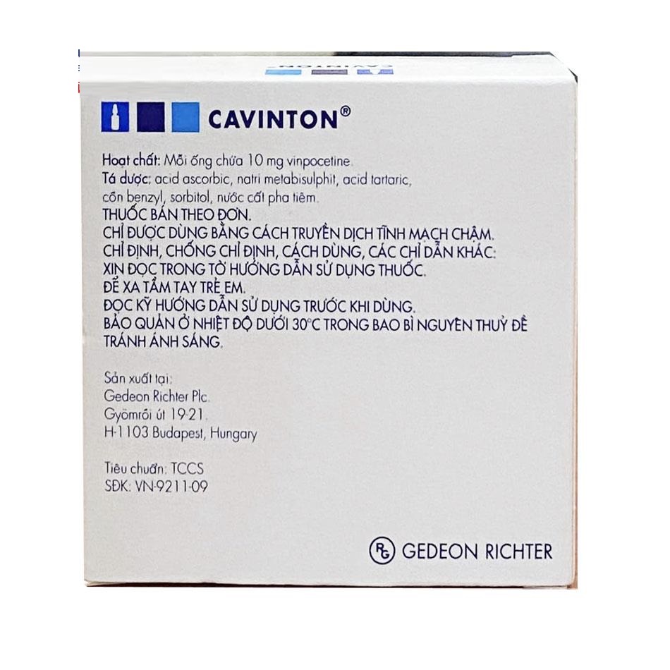 Cavinton 2ml là dung dịch tiêm (dạng ống ampoule) thuộc nhóm thuốc cải thiện tuần hoàn não, được sản xuất bởi Gedeon Richter Plc. – Hungary, một trong những tập đoàn dược phẩm hàng đầu châu Âu.