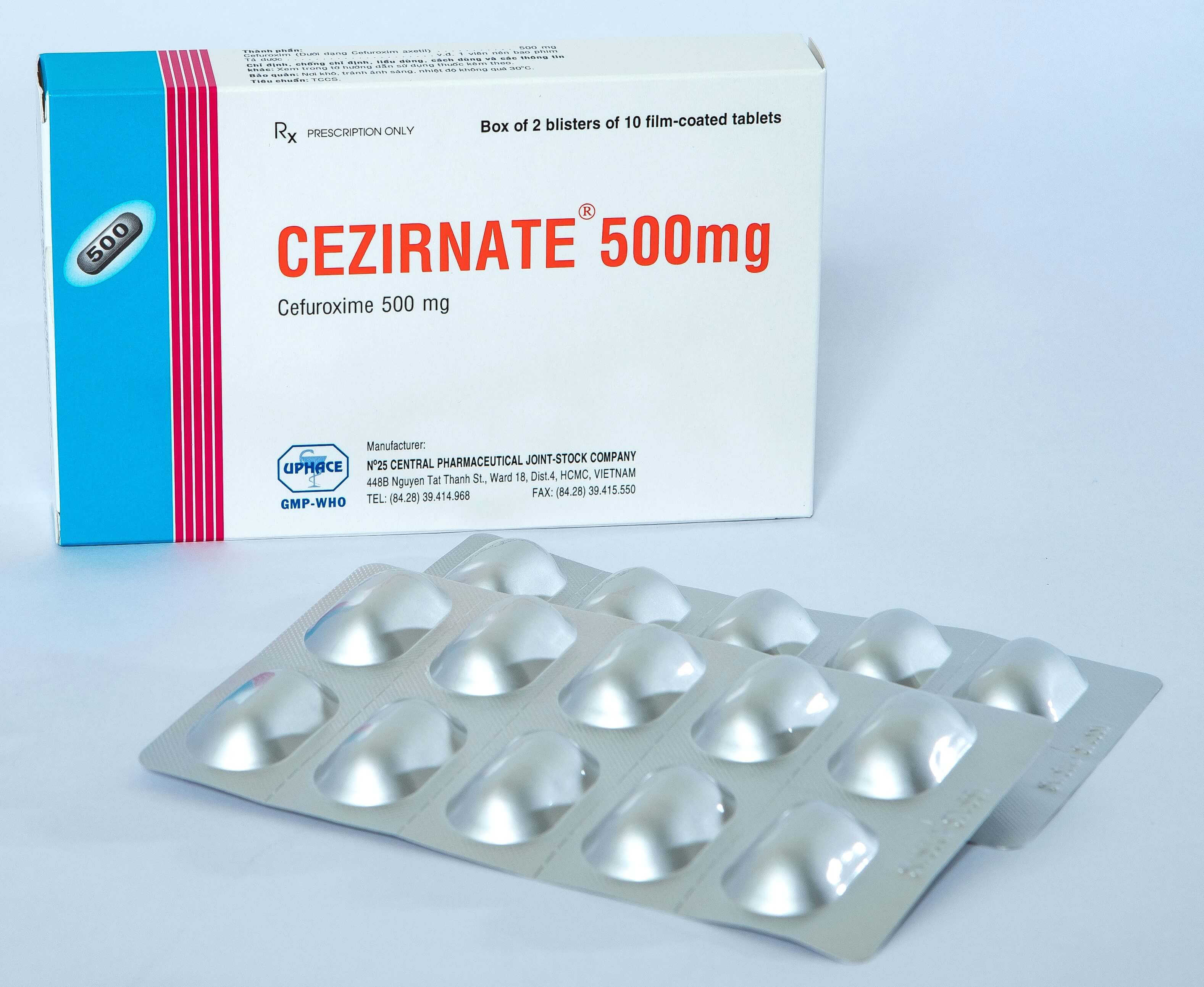 Cezirnate 500mg là thuốc kháng sinh nhóm cephalosporin thế hệ thứ 2, chứa Cefuroxime axetil 500mg (prodrug chuyển hóa 100% thành Cefuroxime hoạt tính).