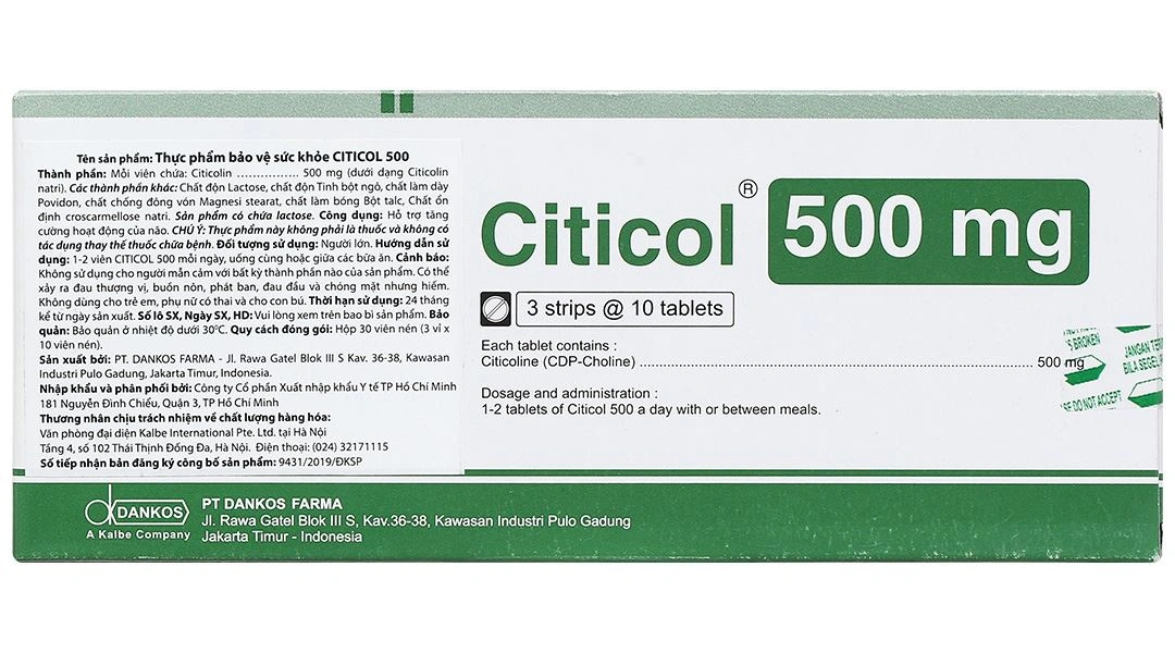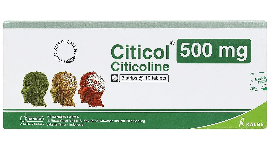 Citicol 500mg là thuốc/thực phẩm bảo vệ sức khỏe chứa Citicolin natri 521,5mg (tương đương Citicolin 500mg) do PT. DANKOS FARMA – công ty dược phẩm lớn thứ 4 Indonesia – sản xuất tại nhà máy đạt chuẩn PIC/S-GMP (tiêu chuẩn GMP nghiêm ngặt nhất thế giới hiện nay).