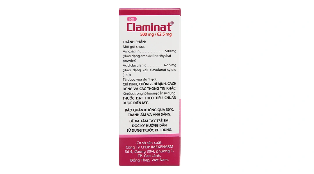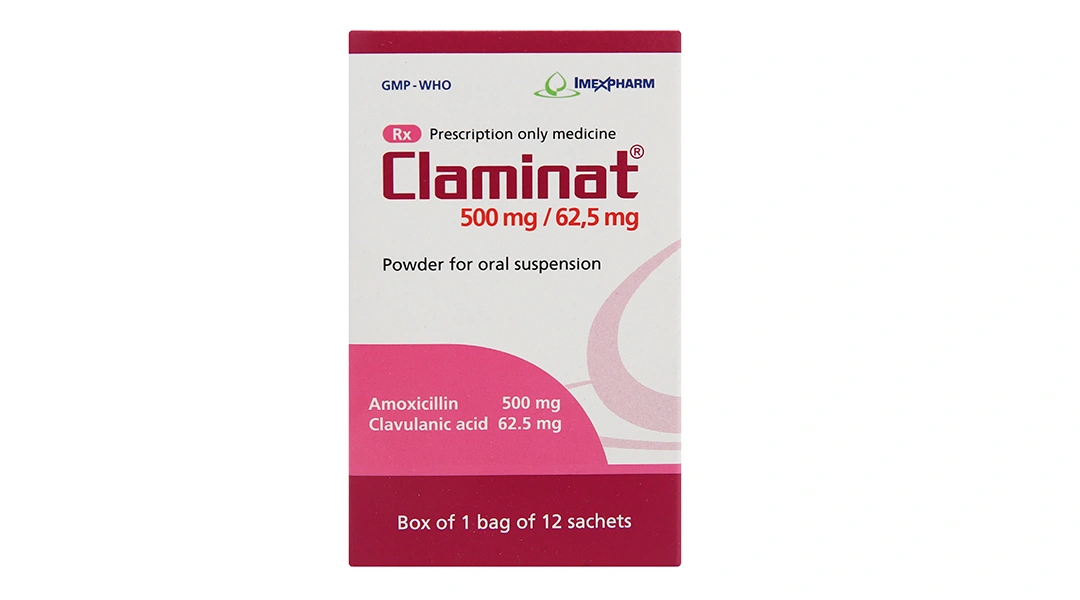 Claminat 500/62.5mg là kháng sinh phối hợp dạng cốm pha hỗn dịch uống, sản xuất bởi Imexpharm – nhà máy đạt chuẩn EU-GMP đầu tiên tại Việt Nam.