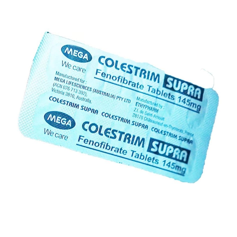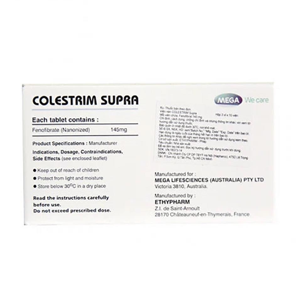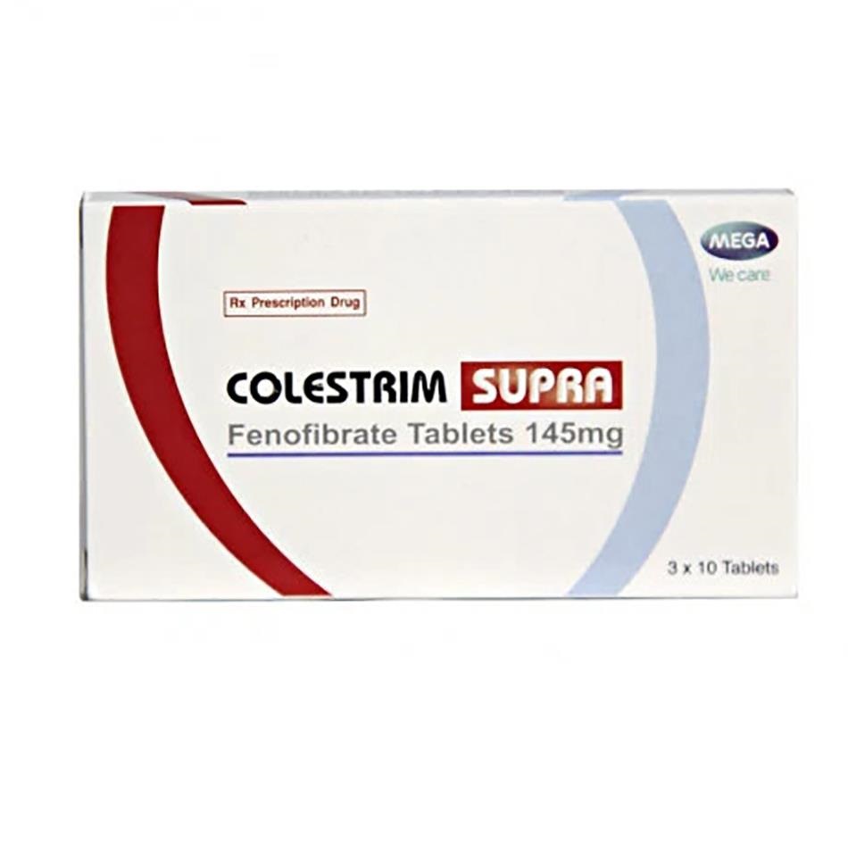 Colestrim Supra 145mg là thuốc hạ lipid máu dạng viên nén bao phim, thuộc nhóm fibrate (dẫn xuất acid fibric), được sản xuất bởi Ethypharm – Pháp và lưu hành tại Việt Nam với số đăng ký VN-18373-14.