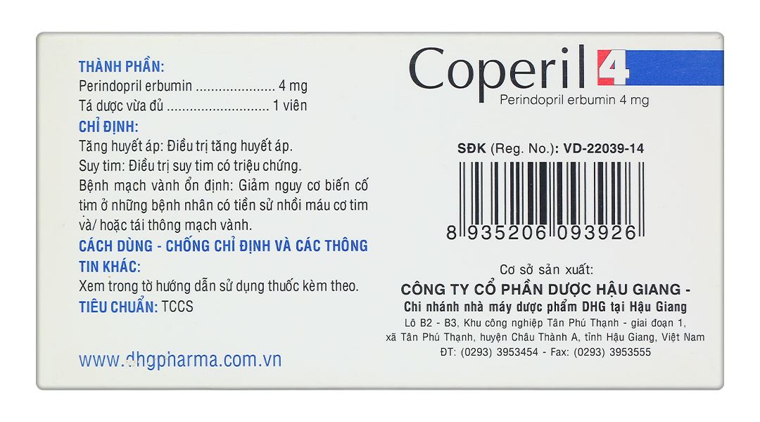 Coperil 4 là một loại thuốc thuộc nhóm ức chế enzyme chuyển angiotensin (ACE inhibitor), được sản xuất bởi Công ty Cổ phần Dược Hậu Giang (DHG Pharma) – một trong những nhà sản xuất dược phẩm uy tín hàng đầu Việt Nam. Với hơn 40 năm kinh nghiệm, DHG Pharma đảm bảo chất lượng sản phẩm đạt chuẩn GMP-WHO, mang đến sự an tâm cho người dùng.