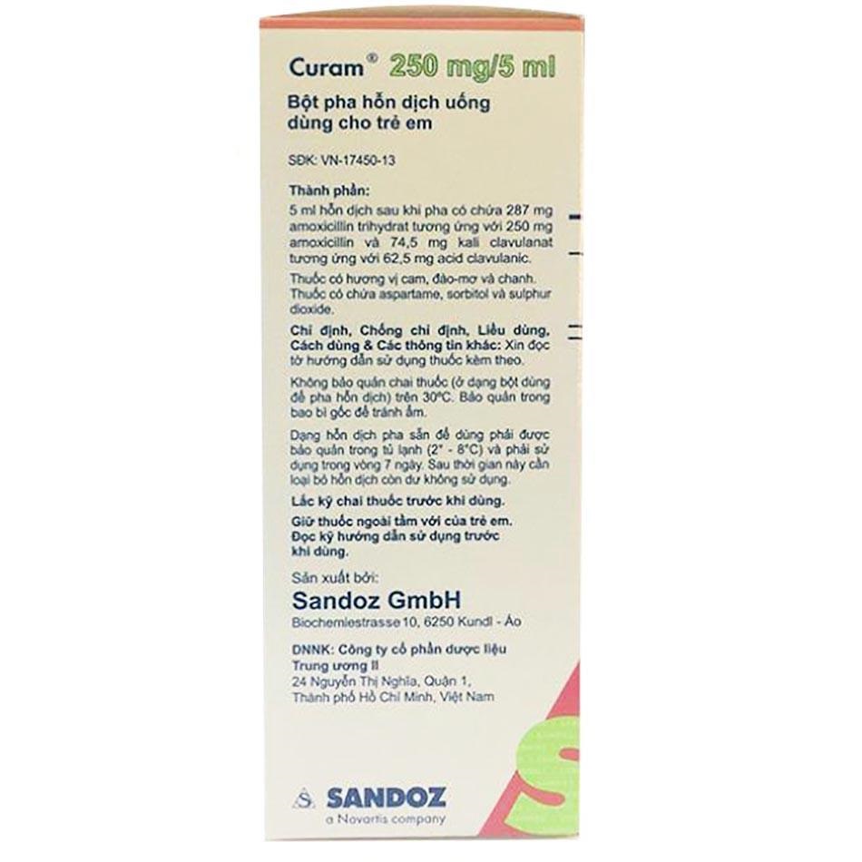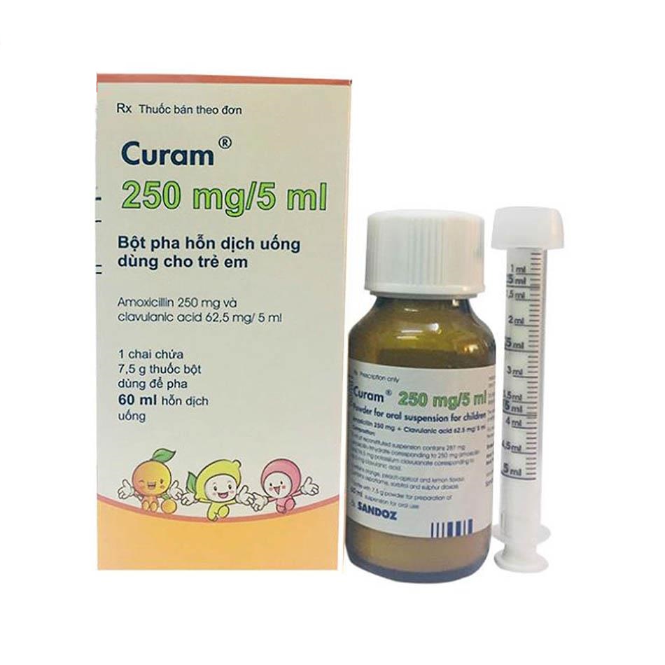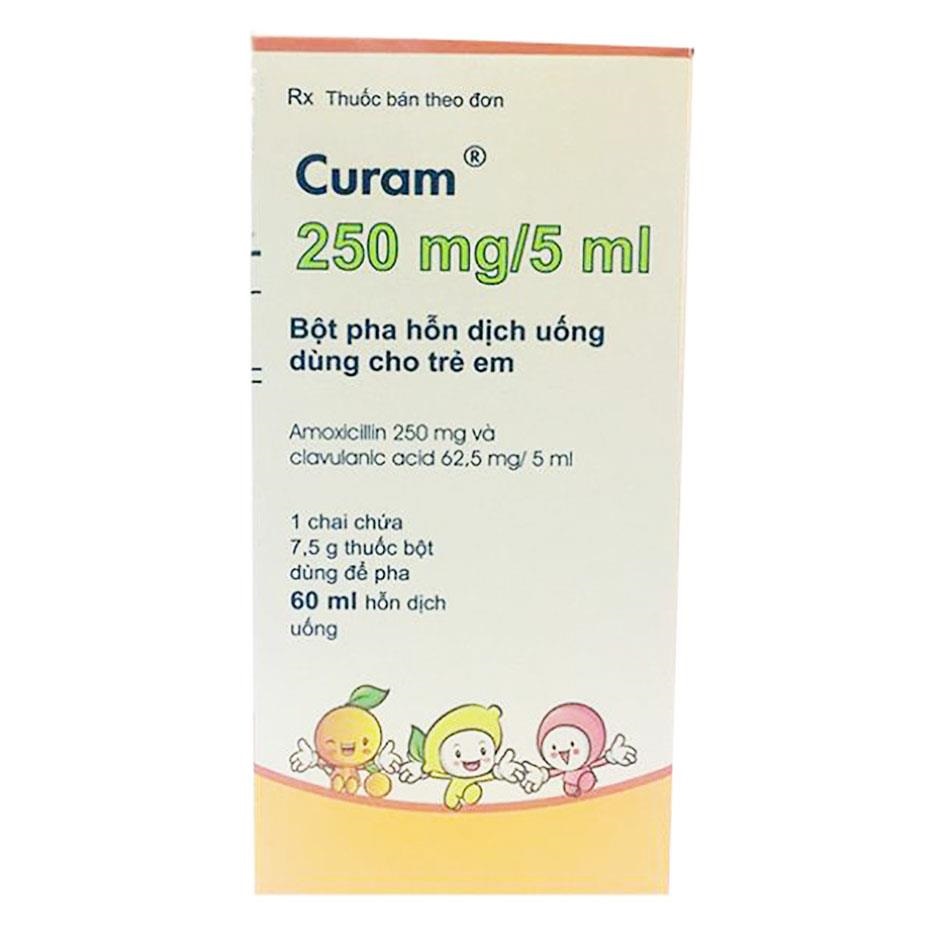 Curam 250mg/5ml là bột pha hỗn dịch uống kháng sinh, dạng chai 60ml sau khi pha (thường chứa 7,5g bột). Thuốc thuộc nhóm kháng sinh beta-lactam phối hợp amoxicillin và acid clavulanic (clavulanate kali).