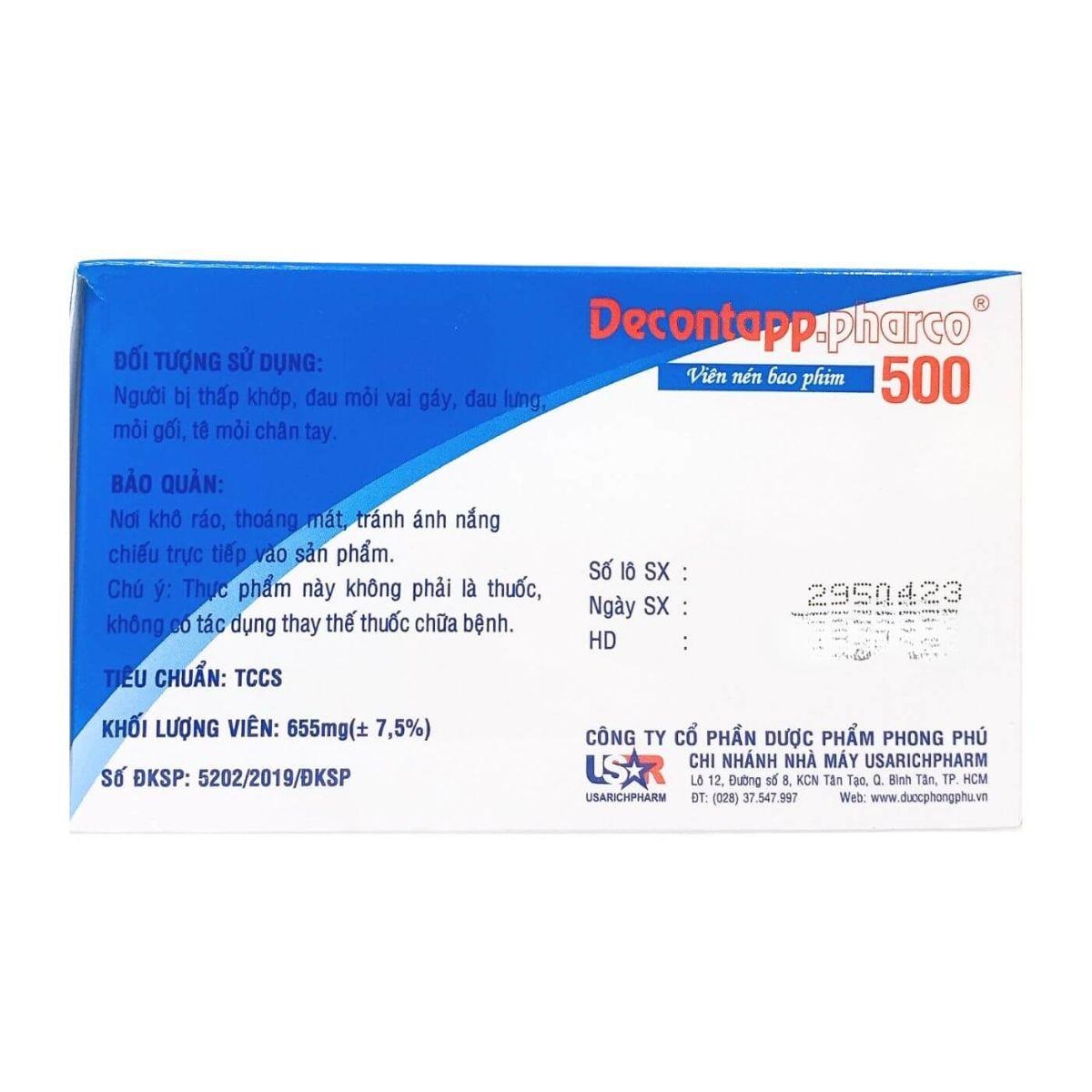Nhờ đó, Decontapp.pharco 500 thường được sử dụng cho các trường hợp đau mỏi vai gáy, đau nhức lưng, đau khớp gối, tê bì tay chân và các vấn đề liên quan đến thấp khớp.