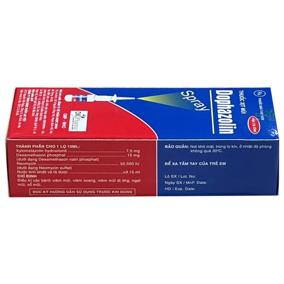 Ngoài ra, thuốc còn chứa nước tinh khiết và các tá dược (như natri clorid, chất bảo quản) để tạo dung dịch ổn định, không gây kích ứng niêm mạc mũi. Sự kết hợp này giúp Dophazolin Spray 15ml trở thành lựa chọn lý tưởng cho các bệnh lý hô hấp có yếu tố viêm và nhiễm trùng.