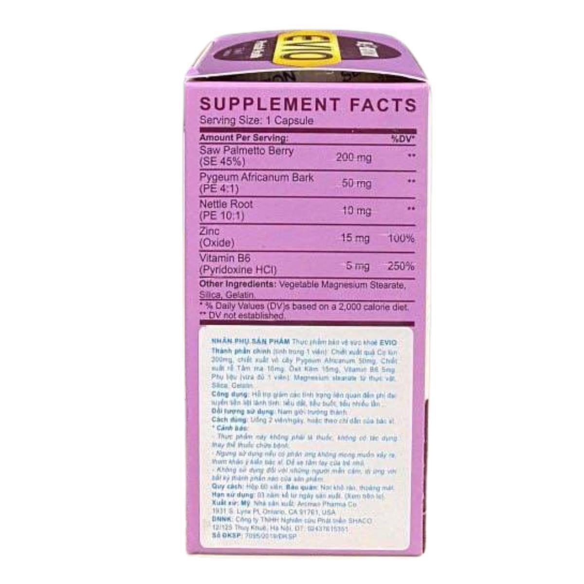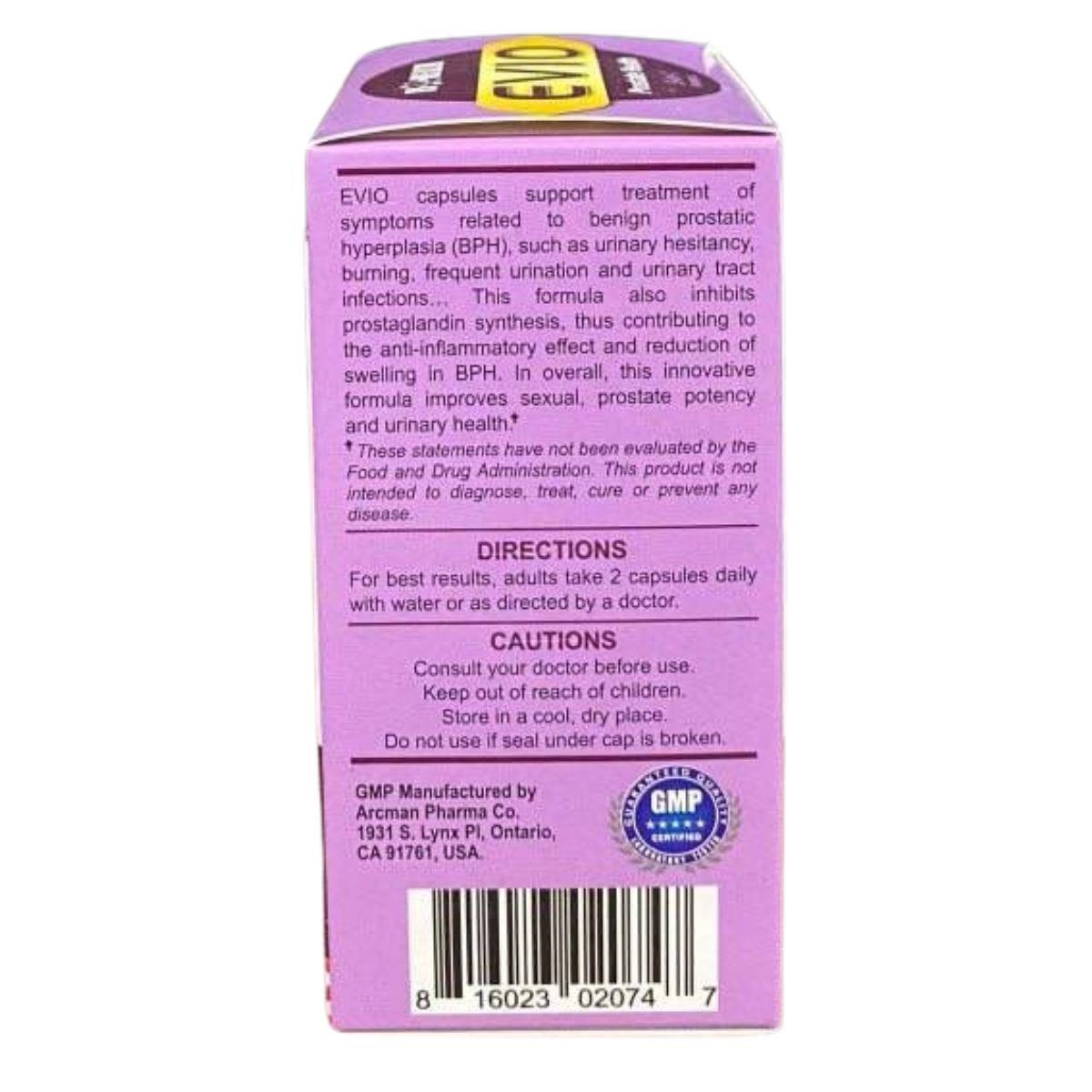 Evio là thực phẩm bảo vệ sức khỏe được sản xuất bởi Arcman Pharma Co., Mỹ, một công ty nổi tiếng với hơn 27 năm kinh nghiệm trong lĩnh vực sản xuất thực phẩm chức năng và thiết bị y tế đạt chuẩn GMP Hoa Kỳ. Sản phẩm được nhập khẩu chính hãng vào Việt Nam, đạt tiêu chuẩn của Cục Quản lý Thực phẩm và Dược phẩm Hoa Kỳ (FDA), và được phân phối bởi các nhà thuốc uy tín. Evio được bào chế dưới dạng viên nang, đóng gói trong lọ 60 viên, với công thức tối ưu từ các thảo dược thiên nhiên, hỗ trợ nam giới trưởng thành và người lớn tuổi cải thiện các vấn đề liên quan đến phì đại tiền liệt tuyến.