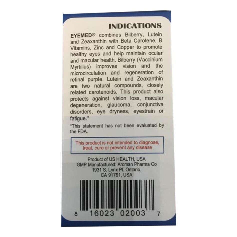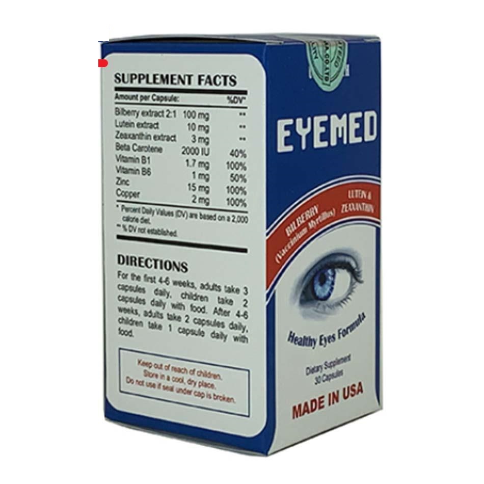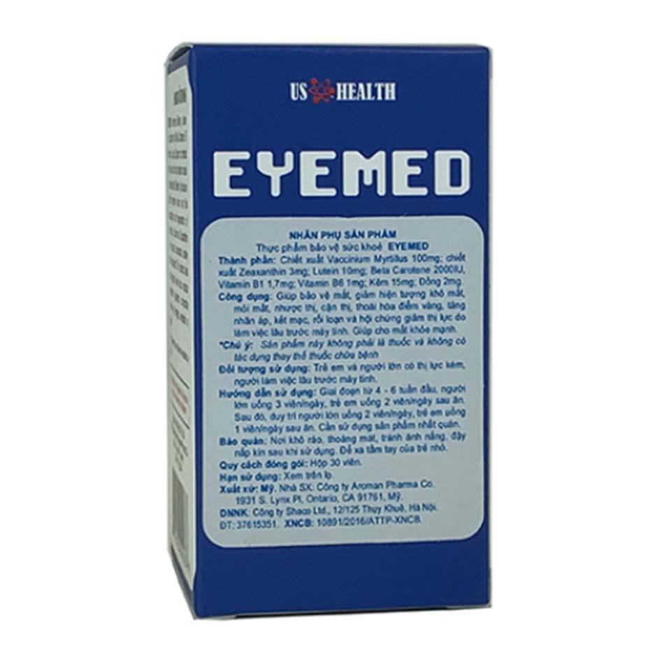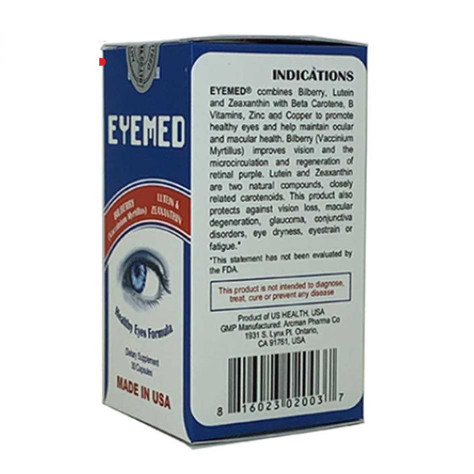 Eyemed là một thực phẩm chức năng dạng viên uống, được đóng gói trong hộp 30 viên, sản xuất tại Mỹ bởi Công ty TME/Crown Vitamins. Sản phẩm được nghiên cứu và phát triển bởi US Health, một thương hiệu uy tín trong lĩnh vực chăm sóc sức khỏe. Với công thức kết hợp các dưỡng chất thiết yếu như chiết xuất việt quất (Bilberry), Lutein, Zeaxanthin, kẽm, và các vitamin, Eyemed hỗ trợ cải thiện sức khỏe thị lực, bảo vệ mắt khỏi các tác nhân gây hại và làm chậm quá trình thoái hóa mắt do tuổi tác hoặc môi trường.