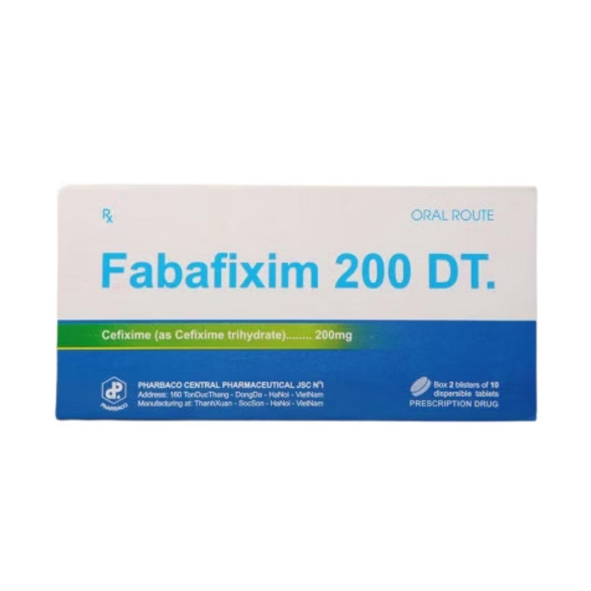 Fabafixim 200 DT (Cefixime 200mg) dạng viên nén phân tán hộp 2 vỉ × 10 viên là kháng sinh đường uống tiện lợi, hiệu quả cao trong điều trị nhiều nhiễm khuẩn phổ biến như viêm tai giữa, viêm họng, viêm amidan, viêm phế quản và nhiễm trùng tiết niệu không biến chứng. Với đặc tính dễ hòa tan, thuốc đặc biệt phù hợp cho trẻ em và người lớn khó nuốt viên thông thường, giúp tăng tuân thủ điều trị.