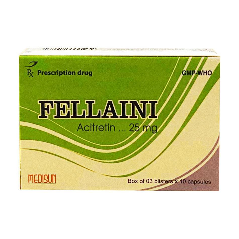 Fellaini là thuốc nội địa chất lượng cao, giá rẻ hơn các retinoid nhập khẩu (như Neotigason/Acitretin Sandoz). Hiệu quả tương đương trong vảy nến nặng, thời gian bán hủy ngắn hơn etretinate giúp an toàn hơn. Ưu điểm: