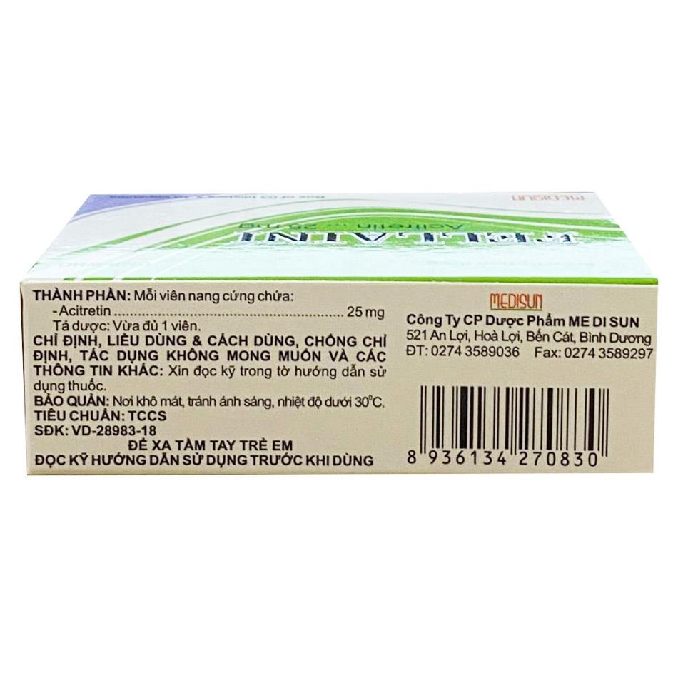 - Hoạt chất: Acitretin 25mg.