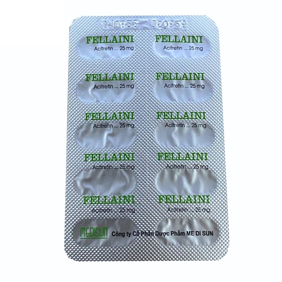 Fellaini 25mg là thuốc kê đơn (ETC), thuộc nhóm retinoid tổng hợp thế hệ hai, là chất chuyển hóa của etretinate với thời gian bán hủy ngắn hơn, giảm nguy cơ tích lũy lâu dài. Thuốc được chỉ định chính cho các bệnh da liễu nghiêm trọng liên quan đến rối loạn sừng hóa (keratinization disorders).