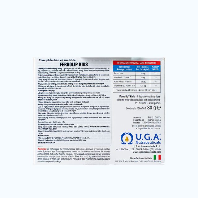 Thực phẩm chức năng Ferrolip Kids 1.5g (hộp 20 gói x 1.5g) là giải pháp bổ sung sắt an toàn, hiệu quả và tiện lợi cho trẻ em từ 1 tuổi trở lên. Với công nghệ màng bao vi nang Liposome, sản phẩm không chỉ tăng khả năng hấp thu mà còn loại bỏ các tác dụng phụ như táo bón hay kích ứng dạ dày, mang lại trải nghiệm dễ chịu với hương dâu tây thơm ngon. Ferrolip Kids là lựa chọn lý tưởng cho các bậc phụ huynh muốn hỗ trợ con cải thiện thiếu máu, tăng cường sức đề kháng, và phát triển toàn diện.