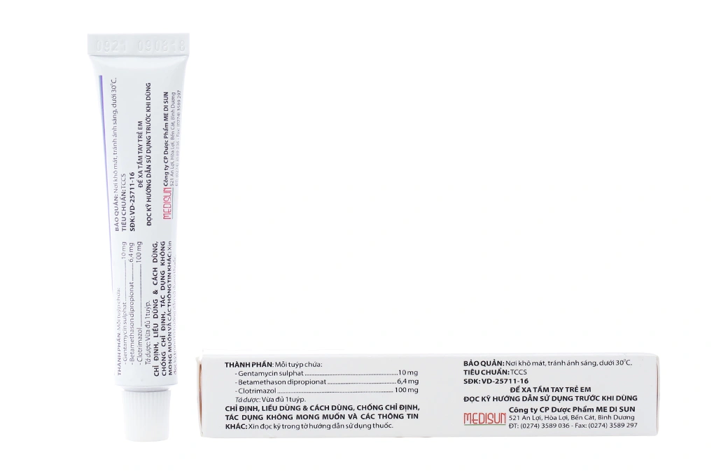 - Betamethason dipropionat 6.4 mg (corticosteroid tổng hợp, có tác dụng chống viêm, giảm ngứa, giảm sưng đỏ mạnh mẽ).