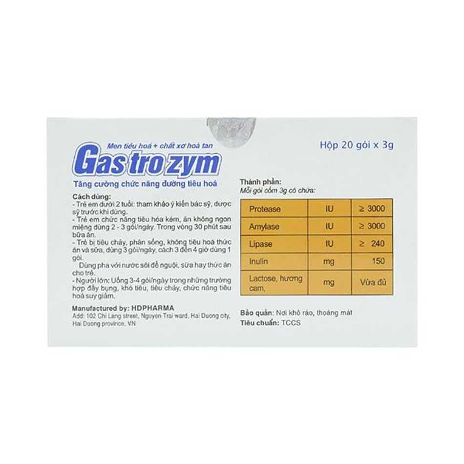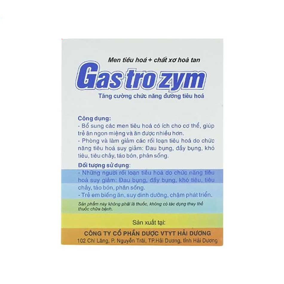 Thực phẩm chức năng Gastrozym 3g là một giải pháp hiệu quả, an toàn để hỗ trợ tiêu hóa, giúp trẻ em và người lớn cải thiện các vấn đề như đầy bụng, khó tiêu, tiêu chảy, táo bón và phân sống. Với công thức kết hợp các enzyme tiêu hóa (Protease, Amylase, Lipase) và chất xơ Inulin, Gastrozym không chỉ giúp trẻ ăn ngon miệng, hấp thu dinh dưỡng tốt hơn mà còn hỗ trợ cân bằng hệ vi sinh đường ruột. Sản phẩm được sản xuất bởi Công ty CP Dược VTYT Hải Dương, đạt các tiêu chuẩn chất lượng cao và được phân phối rộng rãi tại các nhà thuốc uy tín như Nhà thuốc Bạch Mai, nhathuocbachmai.vn.