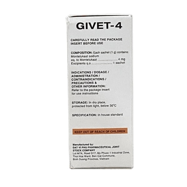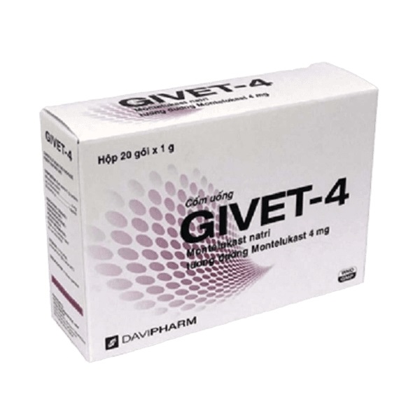 Givet-4 là một loại thuốc kê đơn được sử dụng rộng rãi trong điều trị và dự phòng hen phế quản mạn tính và viêm mũi dị ứng. Thuốc được sản xuất bởi Công ty Cổ phần Dược phẩm Đạt Vi Phú (Davipharm), Việt Nam, đạt tiêu chuẩn GMP-WHO và được Bộ Y tế cấp phép lưu hành với số đăng ký VD-28908-18. Givet-4 chứa hoạt chất chính là Montelukast (4 mg), một chất đối kháng thụ thể leukotriene, giúp giảm các triệu chứng như khó thở, thở khò khè, sổ mũi, ngứa mũi, và hắt hơi.
