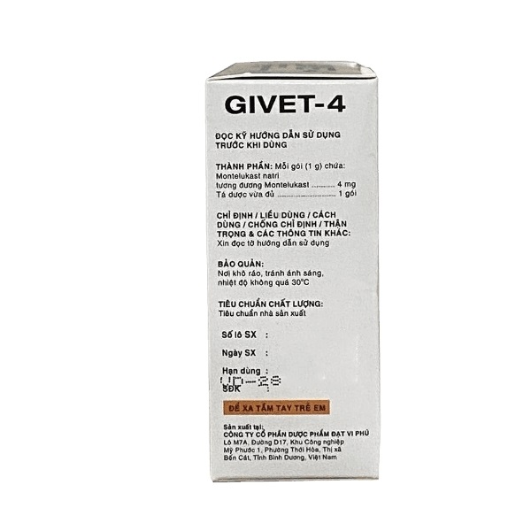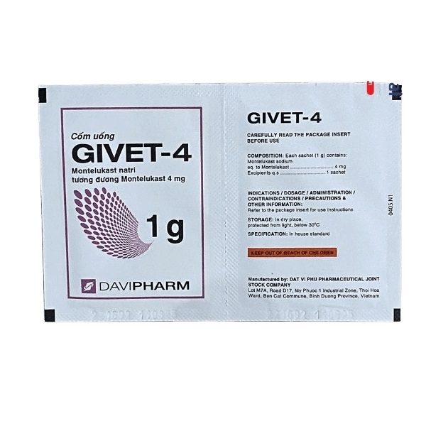 - Thành phần: Givet-4 chứa Montelukast 4 mg, tương tự Singulair, nhưng được bào chế dạng cốm, phù hợp hơn cho trẻ nhỏ.