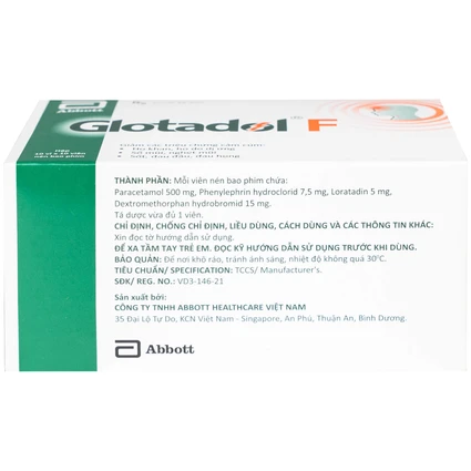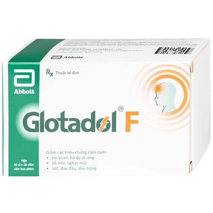 Glotadol F là thuốc giảm triệu chứng cảm lạnh và cảm cúm thông thường, được sản xuất bởi Công ty Cổ phần Dược phẩm Glomed (Việt Nam). Thuốc thuộc nhóm thuốc tác dụng lên đường hô hấp, dạng viên nén bao phim, đóng gói hộp 10 vỉ x 10 viên (tổng 100 viên/hộp).