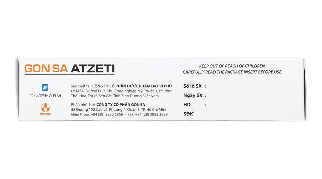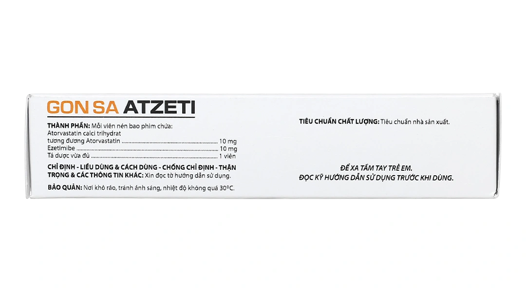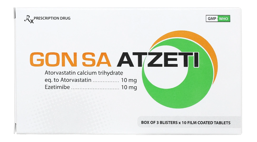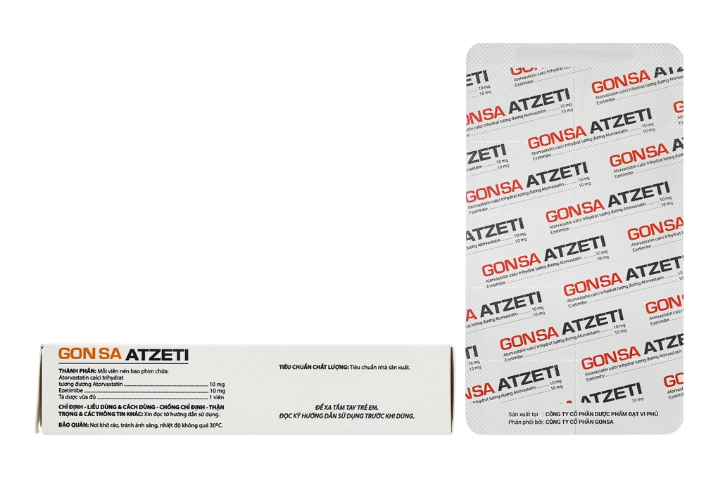 Thuốc Gonsa Atzeti 10/10mg (hay Gon Sa Atzeti 10/10) là viên nén bao phim chứa hai hoạt chất chính: Atorvastatin 10mg và Ezetimibe 10mg. Sản phẩm do Công ty Cổ phần Dược phẩm Đạt Vi Phú (Davipharm – Việt Nam) sản xuất, số đăng ký VD-30340-18. Quy cách đóng gói phổ biến: Hộp 3 vỉ x 10 viên (tổng 30 viên).