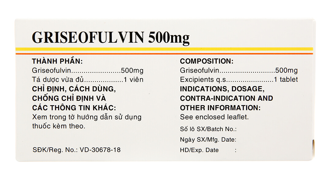 Với số đăng ký VD-30678-18 và thời hạn sử dụng 36 tháng kể từ ngày sản xuất, Griseofulvin 500mg Mekophar là lựa chọn đáng tin cậy cho những ai đang tìm kiếm giải pháp điều trị nấm hiệu quả, an toàn.