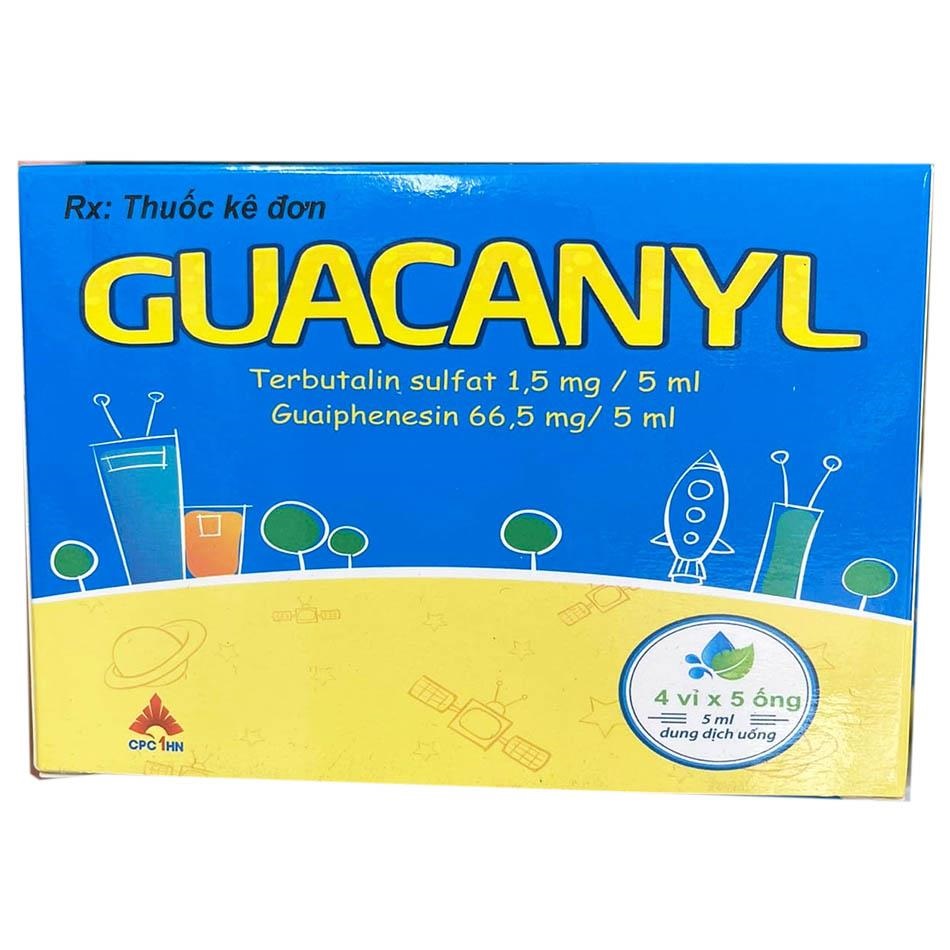 Guacanyl là thuốc giảm ho, long đờm, giãn phế quản, dạng dung dịch uống đóng gói dạng ống nhựa 5ml tiện lợi (cắt đầu ống là uống trực tiếp). Sản phẩm do Công ty Cổ phần Dược phẩm CPC1 Hà Nội (Việt Nam) sản xuất. Số đăng ký: VD-29707-18 (893110281523).