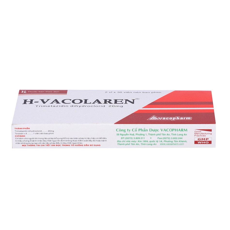 Thuốc H-Vacolaren 20mg (hay Vacolaren 20mg) là viên nén bao phim chứa hoạt chất Trimetazidin dihydroclorid 20mg. Sản phẩm do Công ty Cổ phần Dược Vacopharm (Việt Nam) sản xuất, số đăng ký VD-20909-14. Quy cách đóng gói phổ biến: Hộp 2 vỉ x 30 viên (tổng 60 viên), hoặc hộp lớn hơn như 5 vỉ, 10 vỉ tùy nhà phân phối.