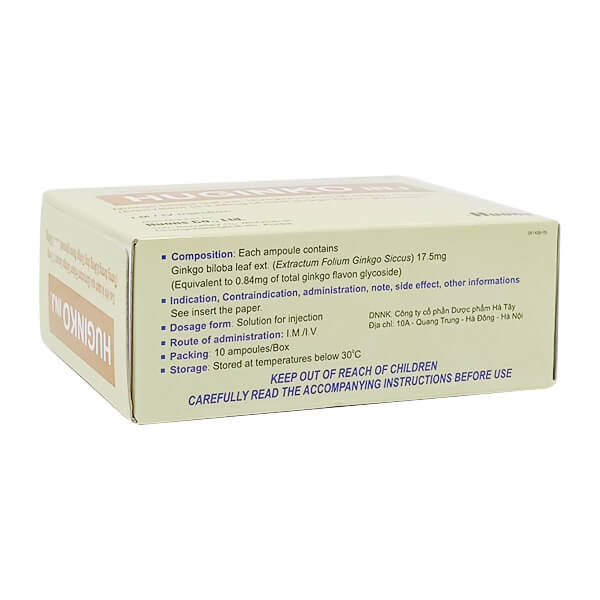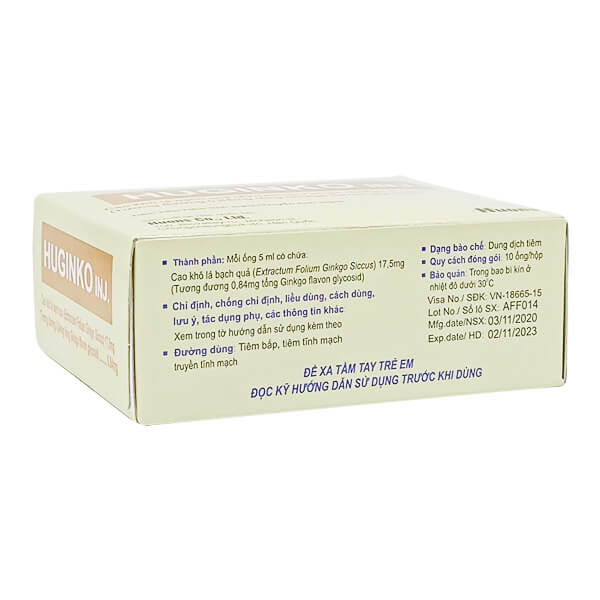 Huginko Inj là thuốc tiêm dạng dung dịch, thuộc nhóm thuốc bổ trợ chức năng não và cải thiện tuần hoàn. Mỗi ống 5ml chứa cao khô lá bạch quả (Extractum Folium Ginkgo Siccus) tương đương 17,5mg, với hàm lượng tổng Ginkgo flavon glycoside khoảng 0,84mg (thường được chuẩn hóa khoảng 24% flavon glycoside và 6% terpene lactone trong các chiết xuất chuẩn).