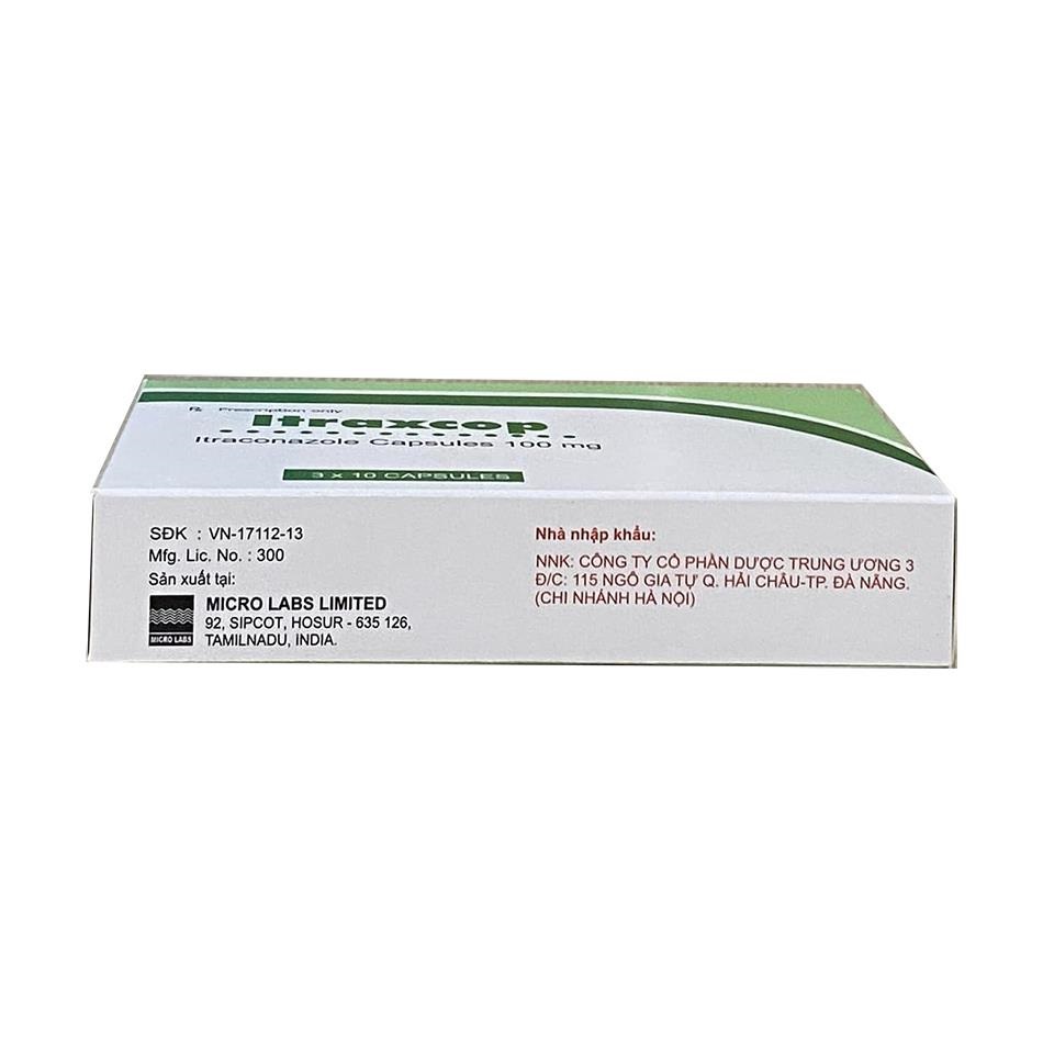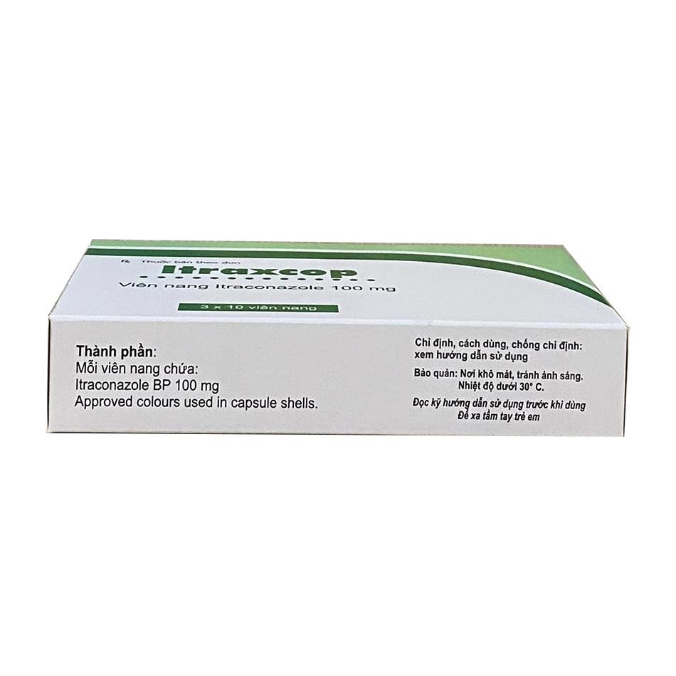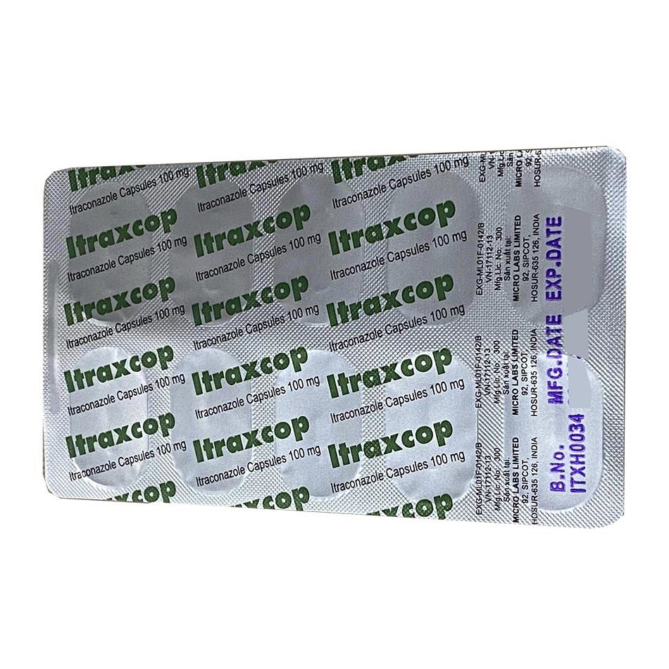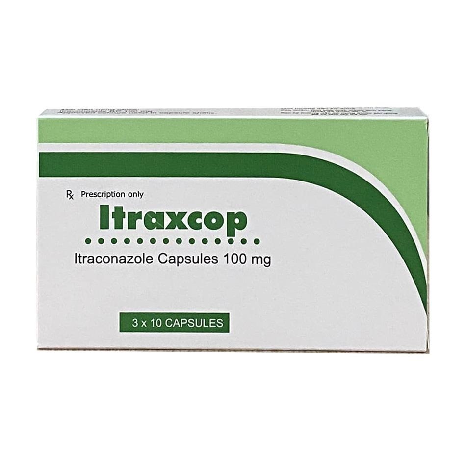 Itraxcop 100mg (tên đầy đủ: Itraxcop Capsule) là viên nang cứng chứa hoạt chất chống nấm Itraconazole 100mg.
