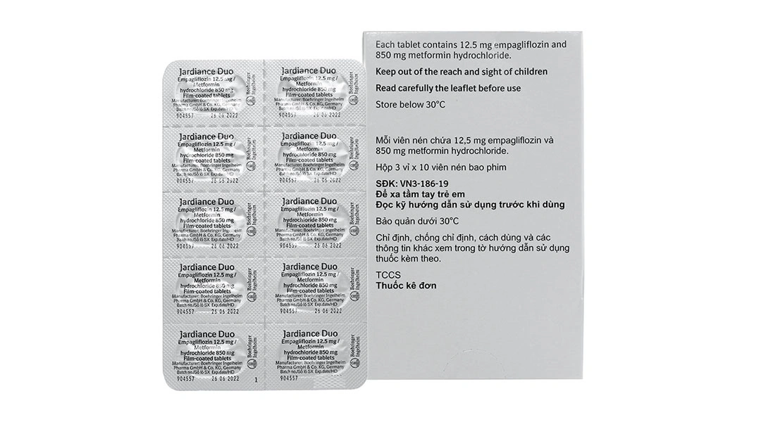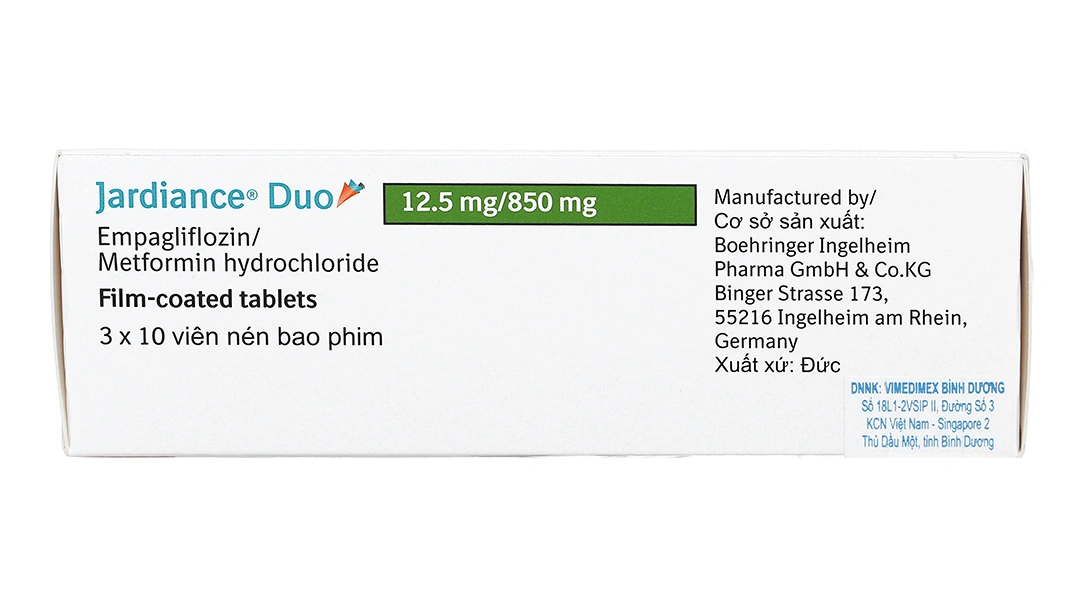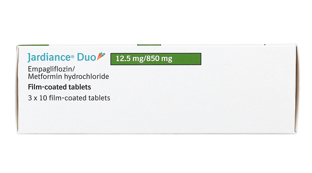 Jardiance Duo 12.5mg/850mg (tên đầy đủ: Jardiance Duo 12.5mg Empagliflozin / 850mg Metformin hydrochloride) là viên nén bao phim kết hợp hai hoạt chất hạ đường huyết từ hai nhóm cơ chế khác nhau.