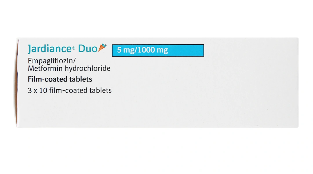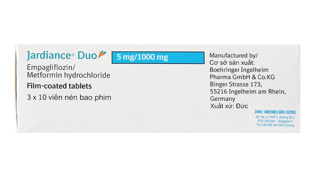 Jardiance Duo 5mg/1000mg (tên đầy đủ: Jardiance Duo 5mg Empagliflozin / 1000mg Metformin hydrochloride) là viên nén bao phim kết hợp hai hoạt chất hạ đường huyết từ hai nhóm cơ chế khác nhau.