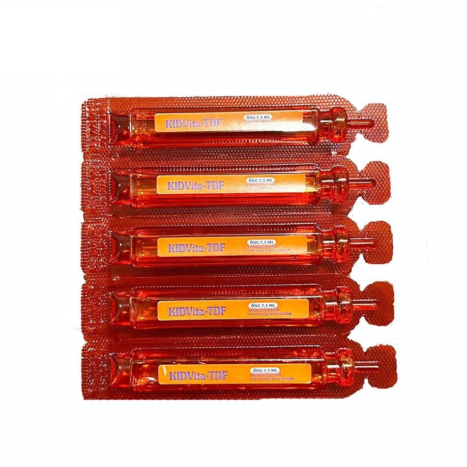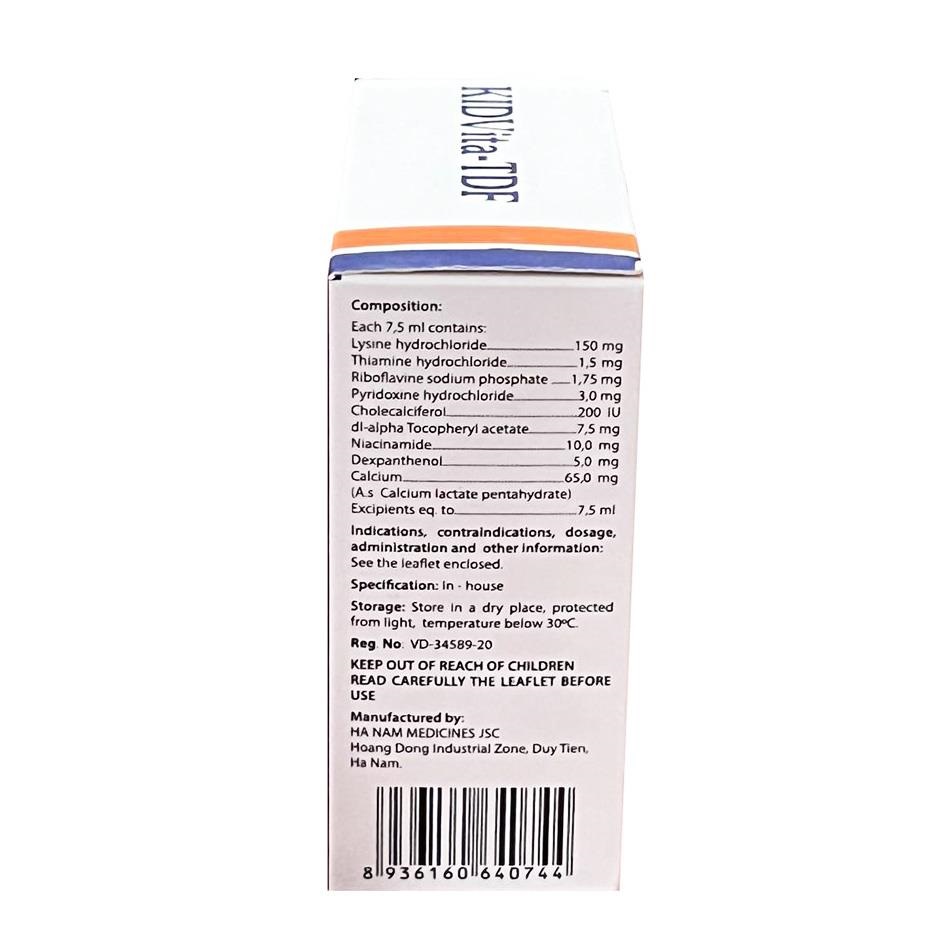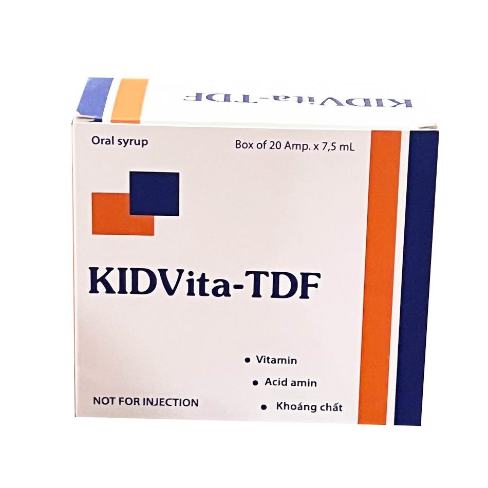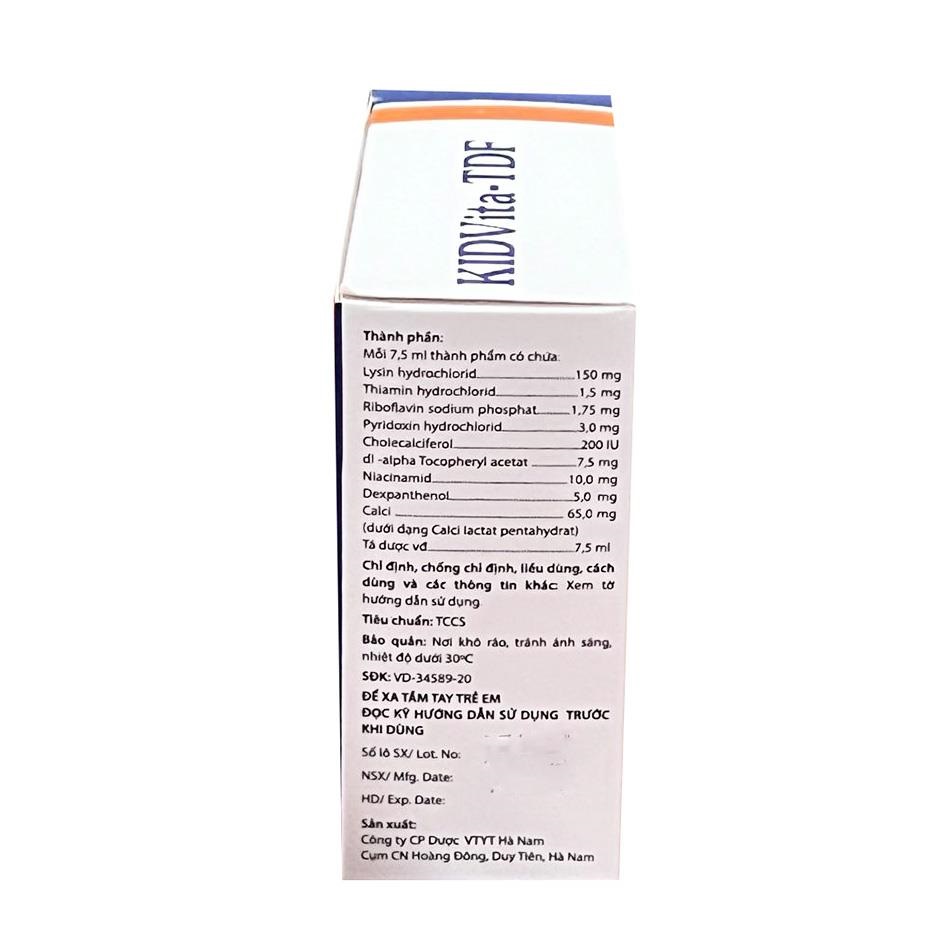 KIDVita-TDF 7.5ml là siro uống dạng ống, thuộc nhóm thuốc bổ sung vitamin và khoáng chất (không kê đơn). Sản phẩm được sản xuất tại Việt Nam bởi Công ty Cổ phần Dược Vật tư Y tế Hà Nam, với số đăng ký VD-34589-20.