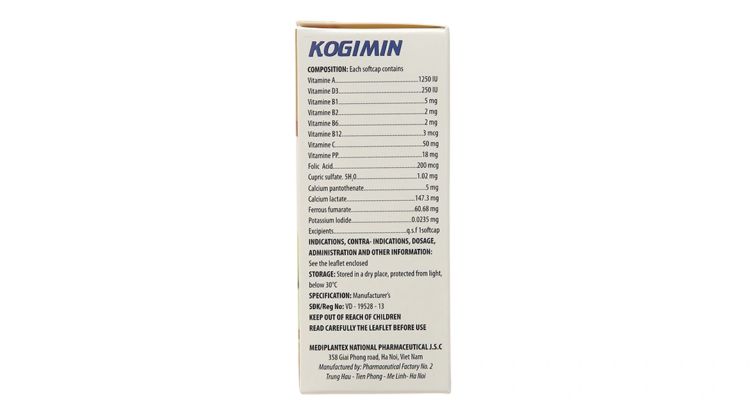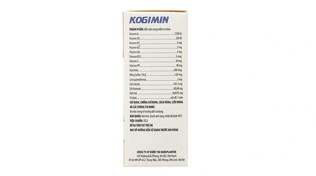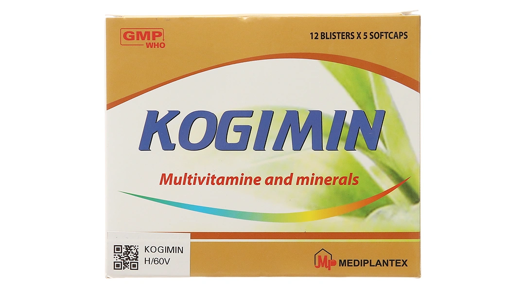 Kogimin là viên nang mềm bổ sung vitamin và khoáng chất được sản xuất bởi Công ty Cổ phần Dược Trung ương Mediplantex – một trong những doanh nghiệp dược phẩm uy tín hàng đầu Việt Nam. Sản phẩm có số đăng ký VD-19528-13, được Bộ Y tế cấp phép lưu hành rộng rãi.