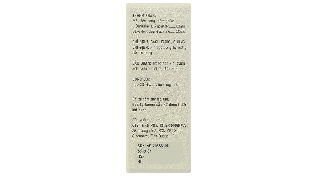 L-Ornithine L-Aspartate là muối bền của hai axit amin ornithine và aspartic acid. Vitamin E (dạng DL-alpha tocopheryl) là chất chống oxy hóa tan trong dầu. Sự kết hợp này tạo nên công thức kép: một bên hỗ trợ chuyển hóa amoniac (độc tố chính gây hại gan), bên kia bảo vệ màng tế bào gan khỏi stress oxy hóa – nguyên nhân gốc rễ của nhiều bệnh gan mạn tính.